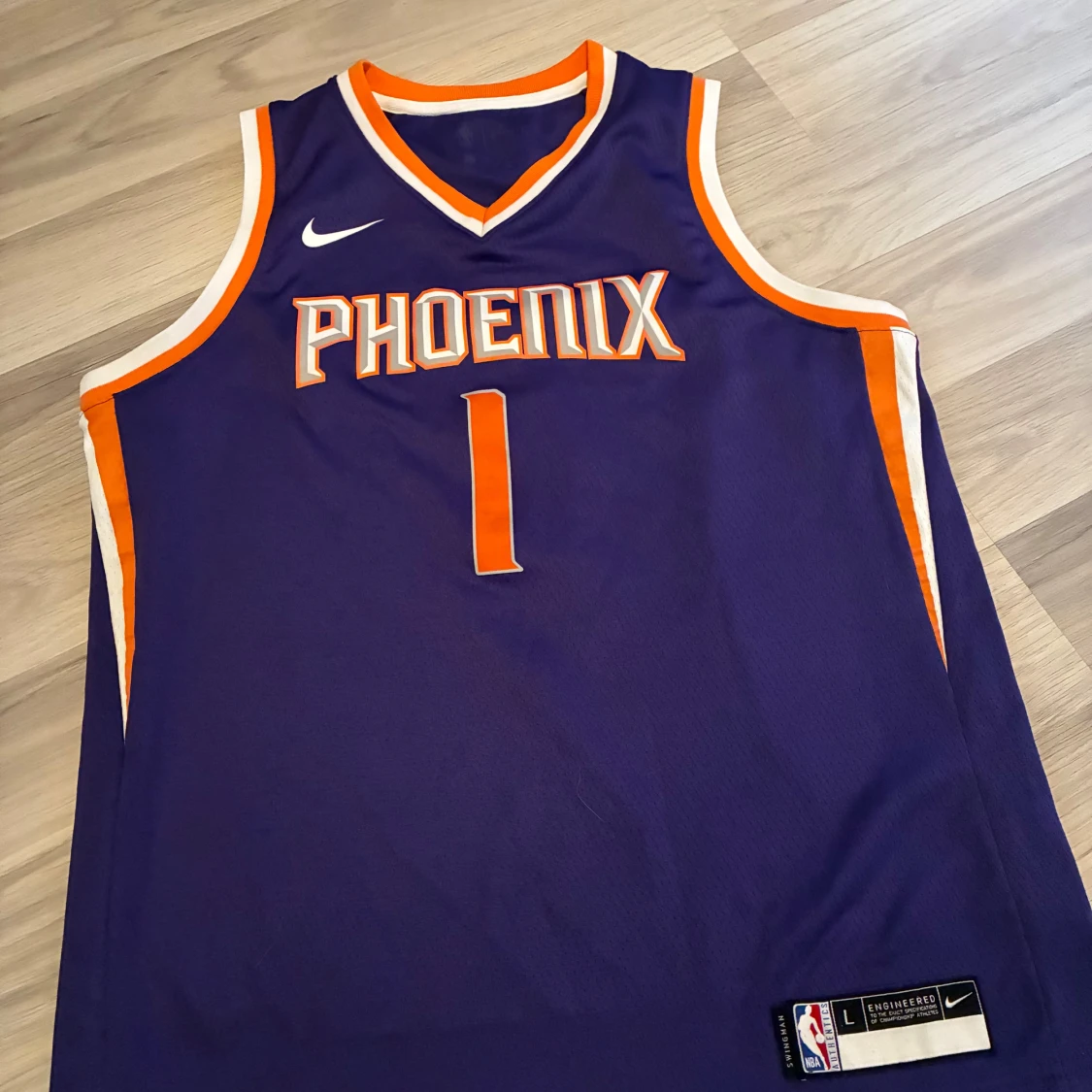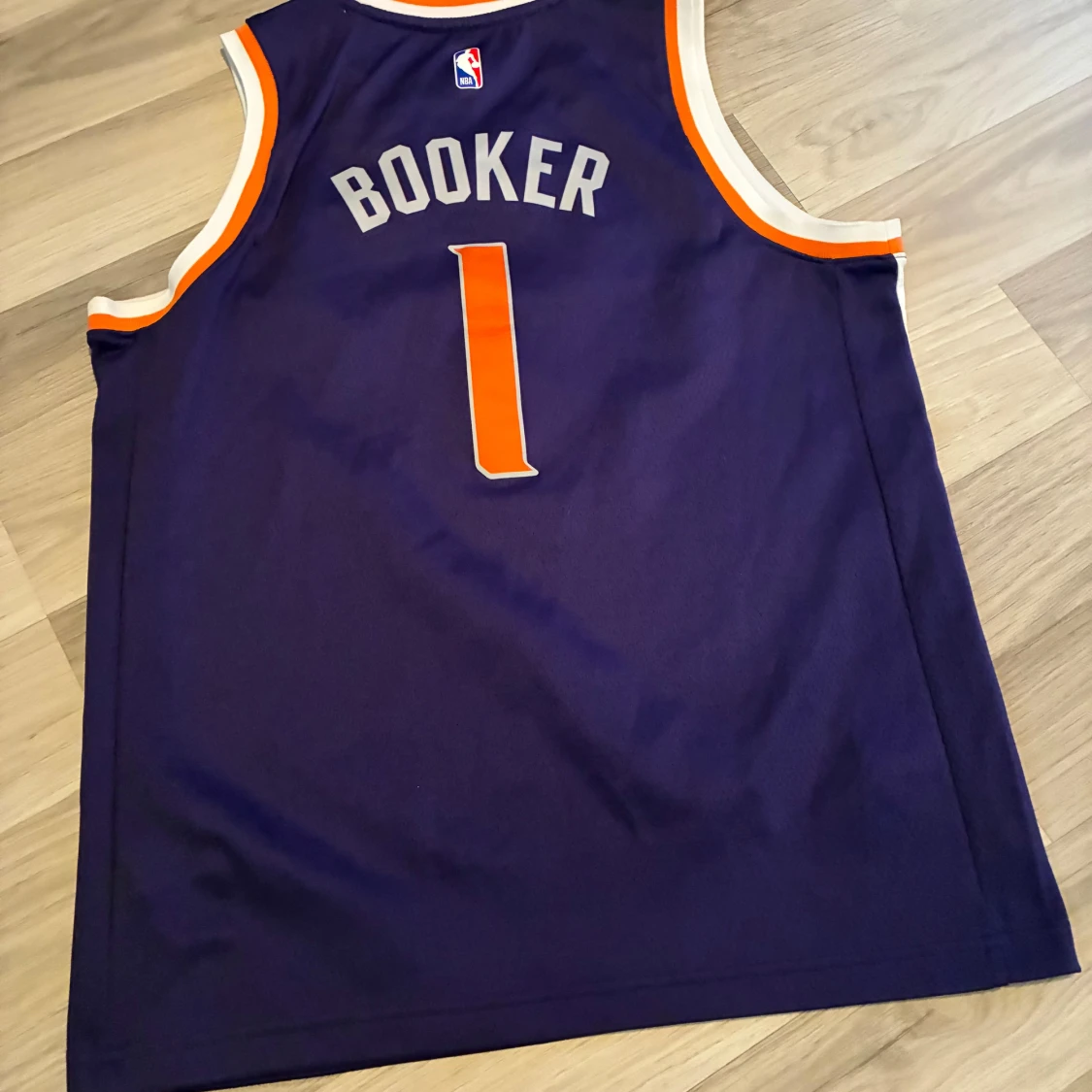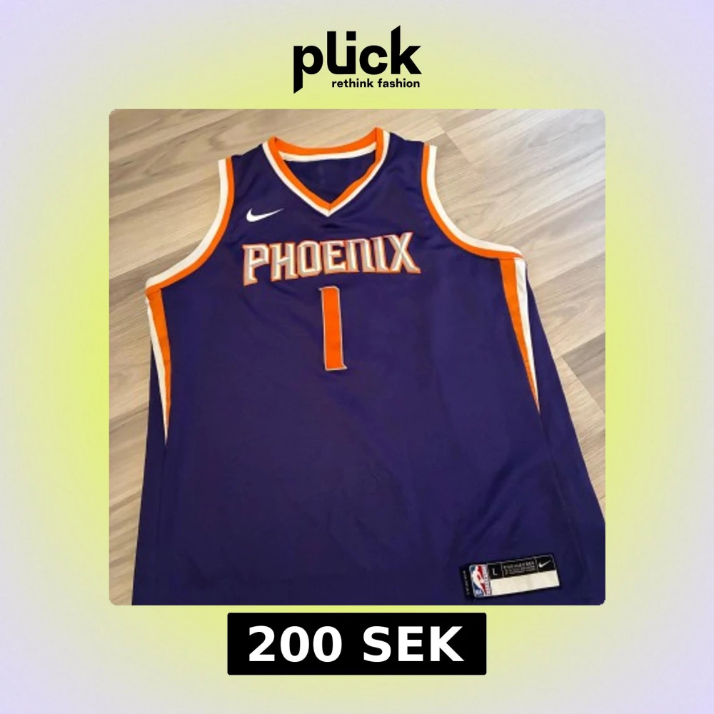 Säljer ett lila basketlinne från Nike med Phoenix Suns-tryck och nummer 1, Booker på ryggen. Linnet har orange och vita detaljer längs kanterna och ärmlös design. Perfekt för basketfans som vill sticka ut på planen eller på läktaren.