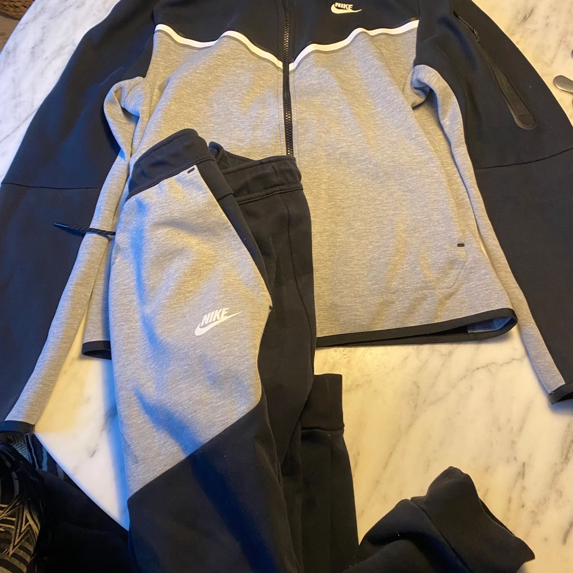 Säljer en snygg grå och svart träningsjacka från Nike med dragkedja framtill. Jackan har långa ärmar och en stilren design med Nike-logga på bröstet. Perfekt för träning eller en sportig look.