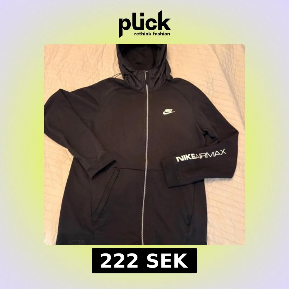 Svart Nike Air Max hoodie med hel dragkedja, huva med snörning och vita logotyper på bröstet och ärmen. Praktiska fickor framtill och sportig look.