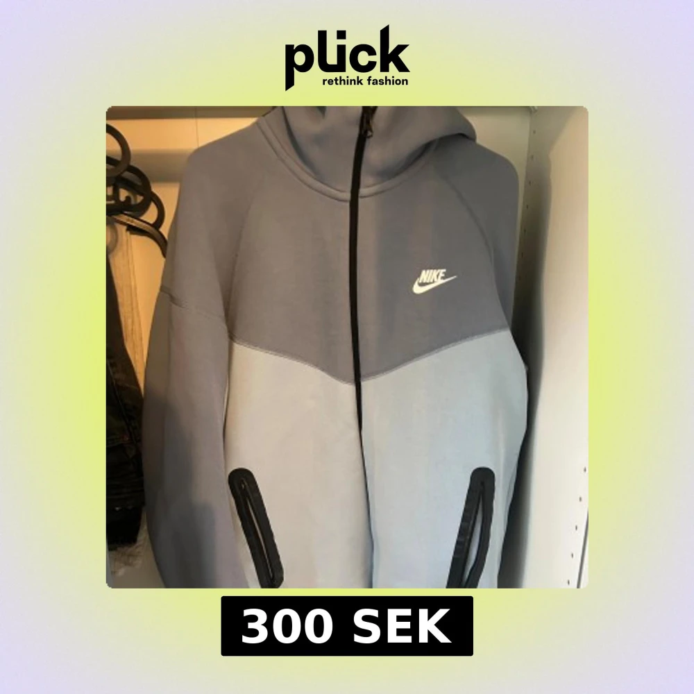 Nike hoodie i två nyanser av blått med dragkedja framtill och svarta detaljer vid fickorna. Tröjan har huva och Nike-logga på bröstet. Perfekt för en sportig och avslappnad stil.