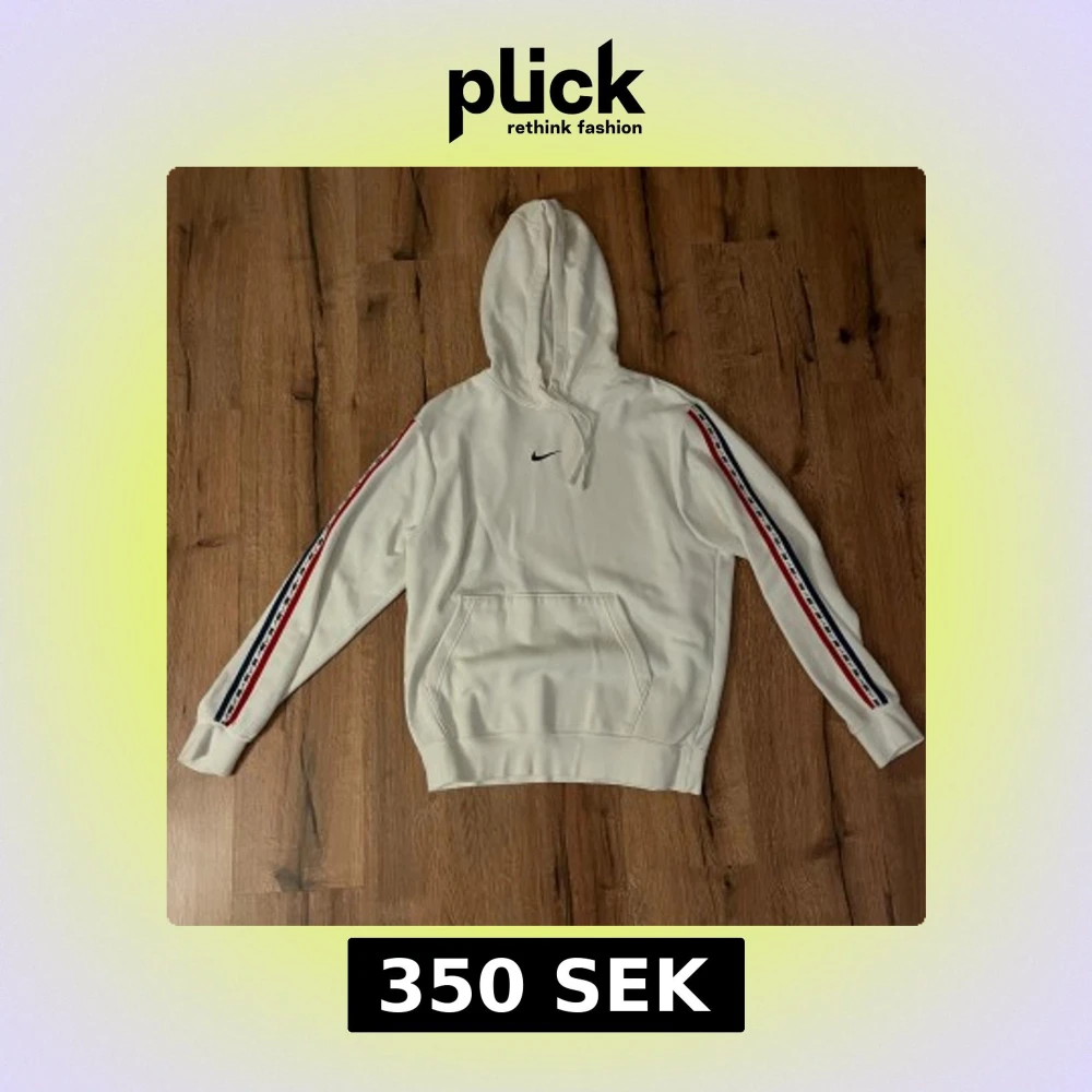 Säljer en stilren vit hoodie från Nike med svarta och röda detaljer längs ärmarna. Den har en klassisk känguruficka och en justerbar huva. Perfekt för en sportig look eller avslappnade dagar. 🏃♂️