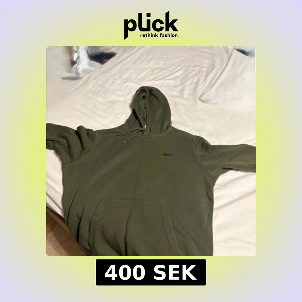 Säljer en olivgrön hoodie från Nike med klassisk logga på bröstet. Tröjan har huva med dragsko och en stor magficka framtill. Perfekt för en avslappnad stil.