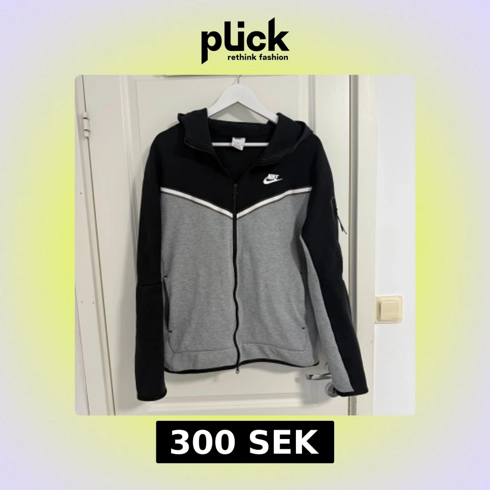 Säljer en snygg grå och svart hoodie från Nike med dragkedja och huva. Koftan har en vit Nike-logga på bröstet och en praktisk ficka på ärmen.