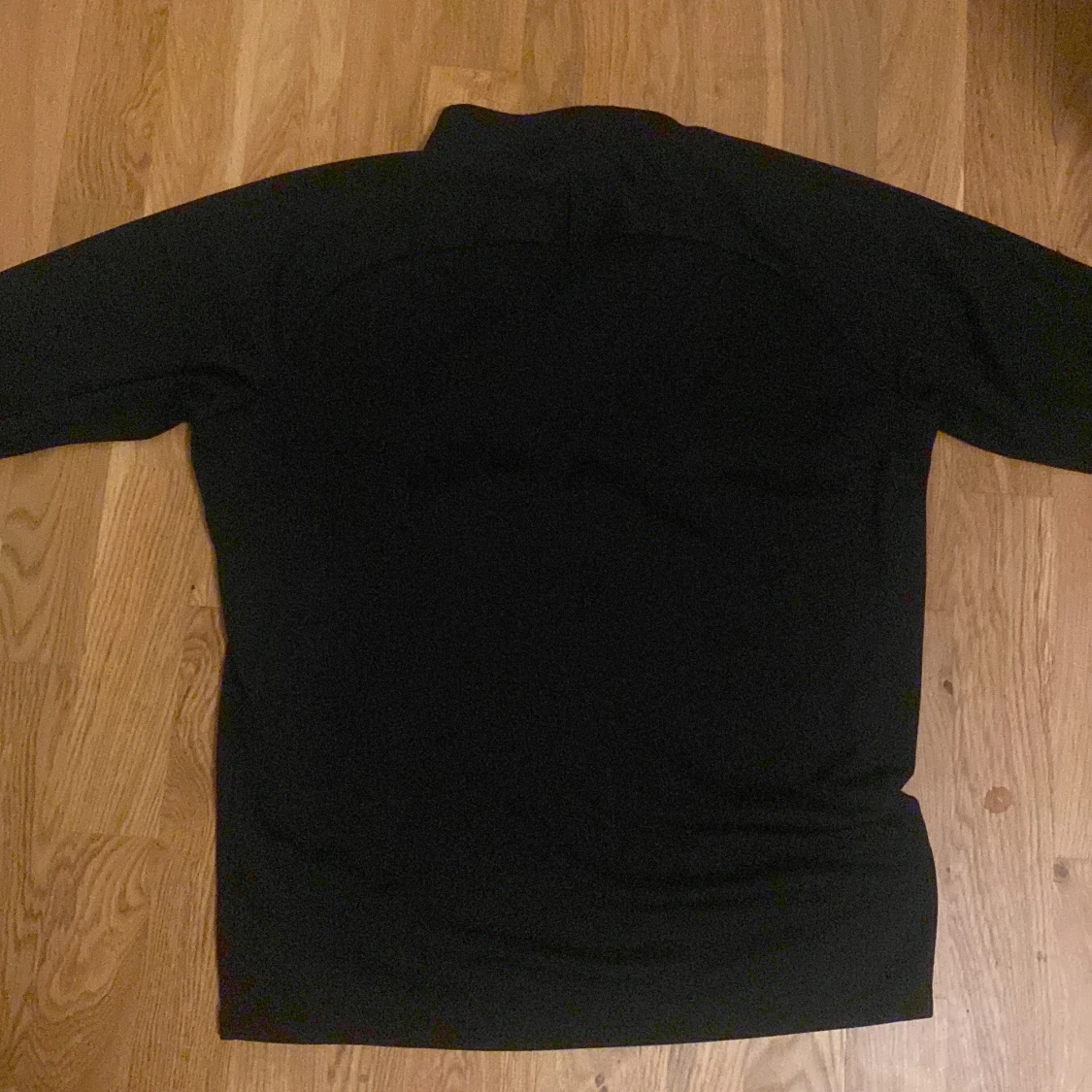 Säljer en svart långärmad tröja från Nike med en vit horisontell rand över bröstet och en liten dragkedja vid halsen. Perfekt för träning eller vardagsbruk. Tröjan har en sportig look med en diskret Nike-logga på bröstet.