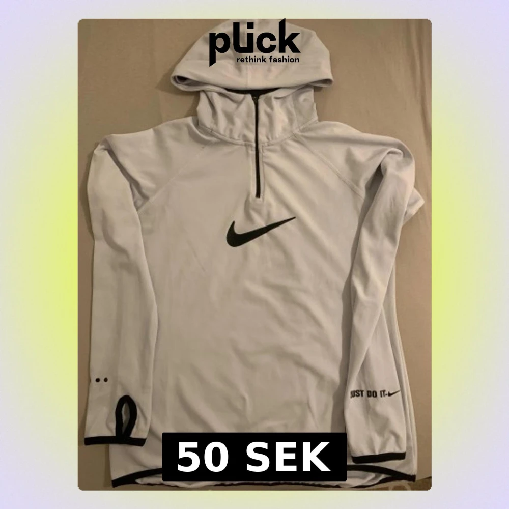 Nike hoodie i vit med svart logga och texten 'Just Do It.' på ärmen. Tröjan har huva, half zip och svarta detaljer vid muddar och nederkant. Tillverkad i mjuk polyester med meshfoder i huvan, perfekt för träning eller chill. Tumhål på ärmarna för extra komfort.