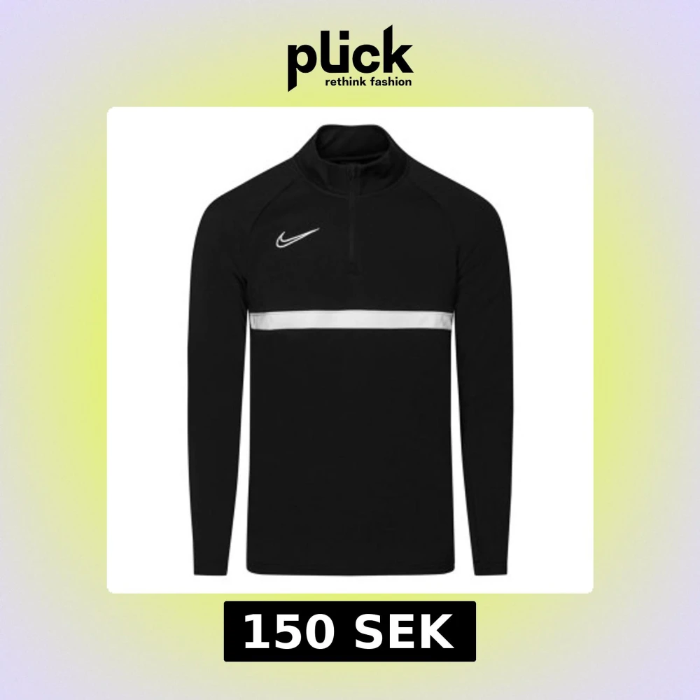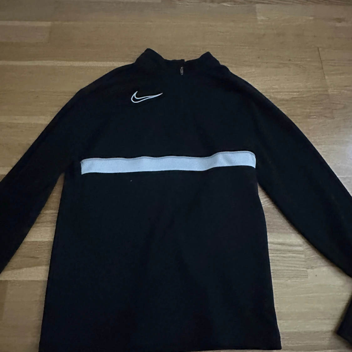 Svart långärmad tröja från Nike med vit logga på bröstet och en vit horisontell rand över magen. Tröjan har en half zip-dragkedja vid halsen och är gjord i ett mjukt syntetmaterial som passar perfekt till träning. Enkel och sportig design.