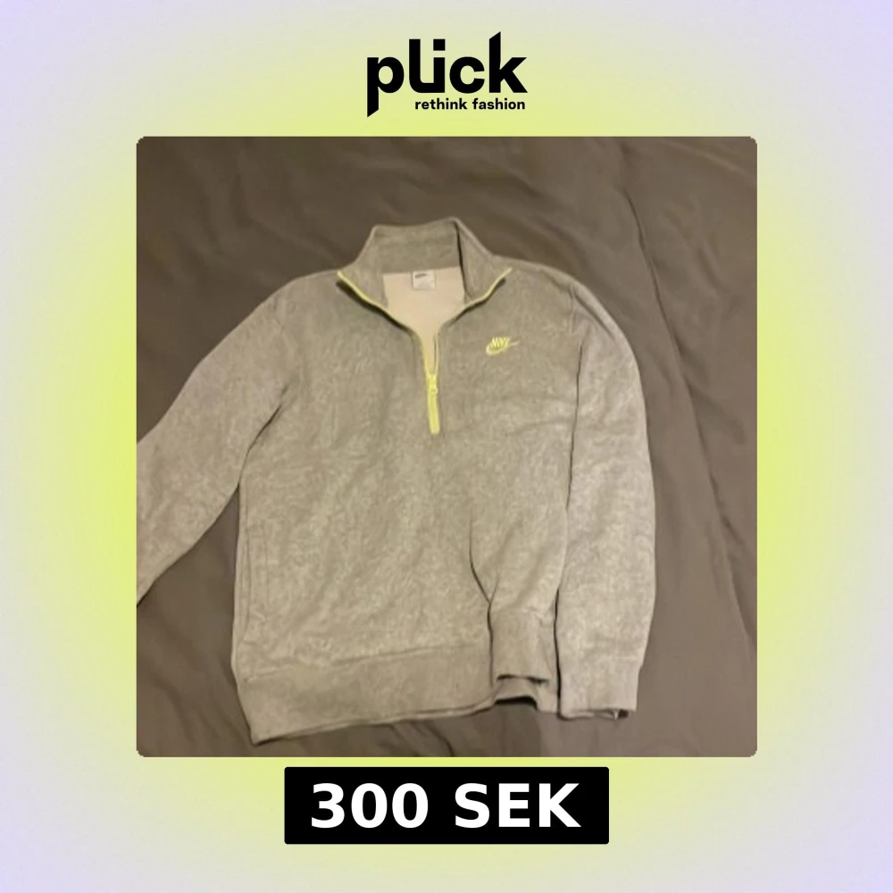 Säljer en grå tröja från Nike med halv dragkedja och broderad logga i limegrönt. Tröjan har långa ärmar och är perfekt för en sportig look. Den är tillverkad i ett mjukt material som känns bekvämt mot huden.