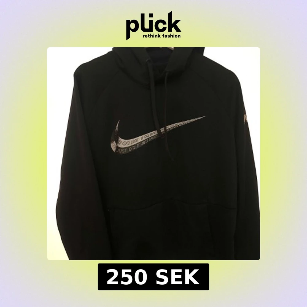 Svart Nike Therma-Fit hoodie med stor silvrig Swoosh och texten 'Just Do It' på bröstet. Tröjan har huva med snörning och en stor magficka. Perfekt för dig som gillar sportig och clean stil.