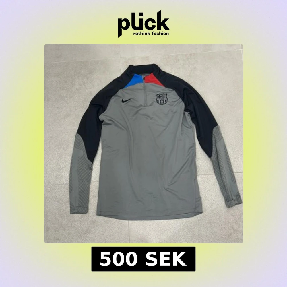 Snygg långärmad träningströja från Nike med FC Barcelona-logga på bröstet. Tröjan är grå med svarta ärmar och har detaljer i blått och rött vid kragen. Tillverkad i ett lätt och funktionellt material, perfekt för fotbollsträning.
