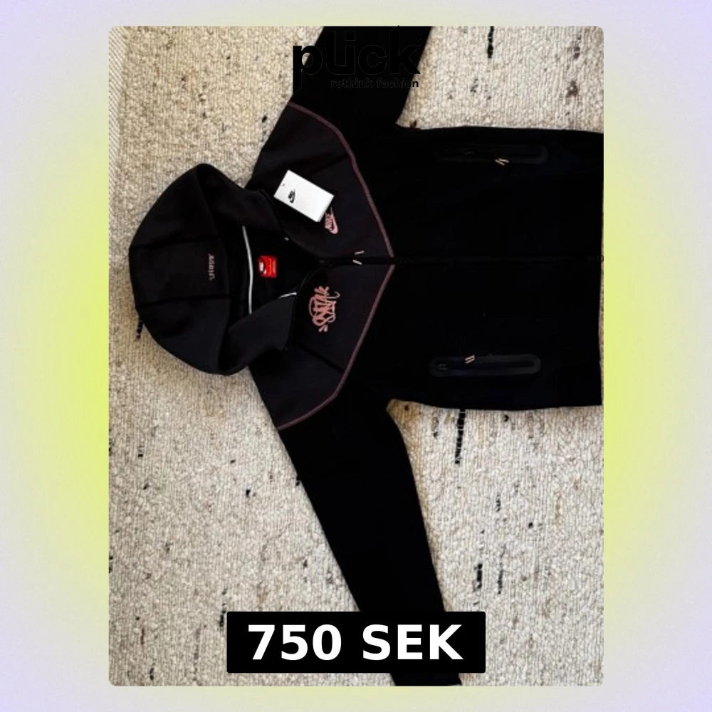 Svart-grå Nike Tech med huva och dragkedja framtill. Det är en collab mellan Nike och Syna Wrld. Jackan har rosa detaljer och logga på bröstet samt två fickor med dragkedja. Prislapp tillkommer vid köp.