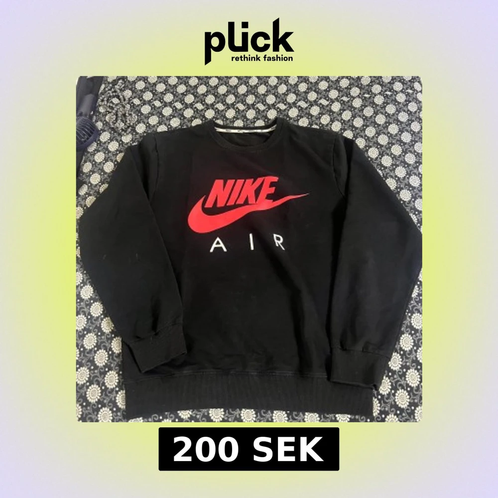 Svart sweatshirt från Nike med stor röd Nike Air-logga framtill. Tröjan har rund hals, långa ärmar och ribbade muddar vid ärmslut och nederkant. Perfekt för en sportig och avslappnad stil. Lite smutsig men allt går bort i tvätten.