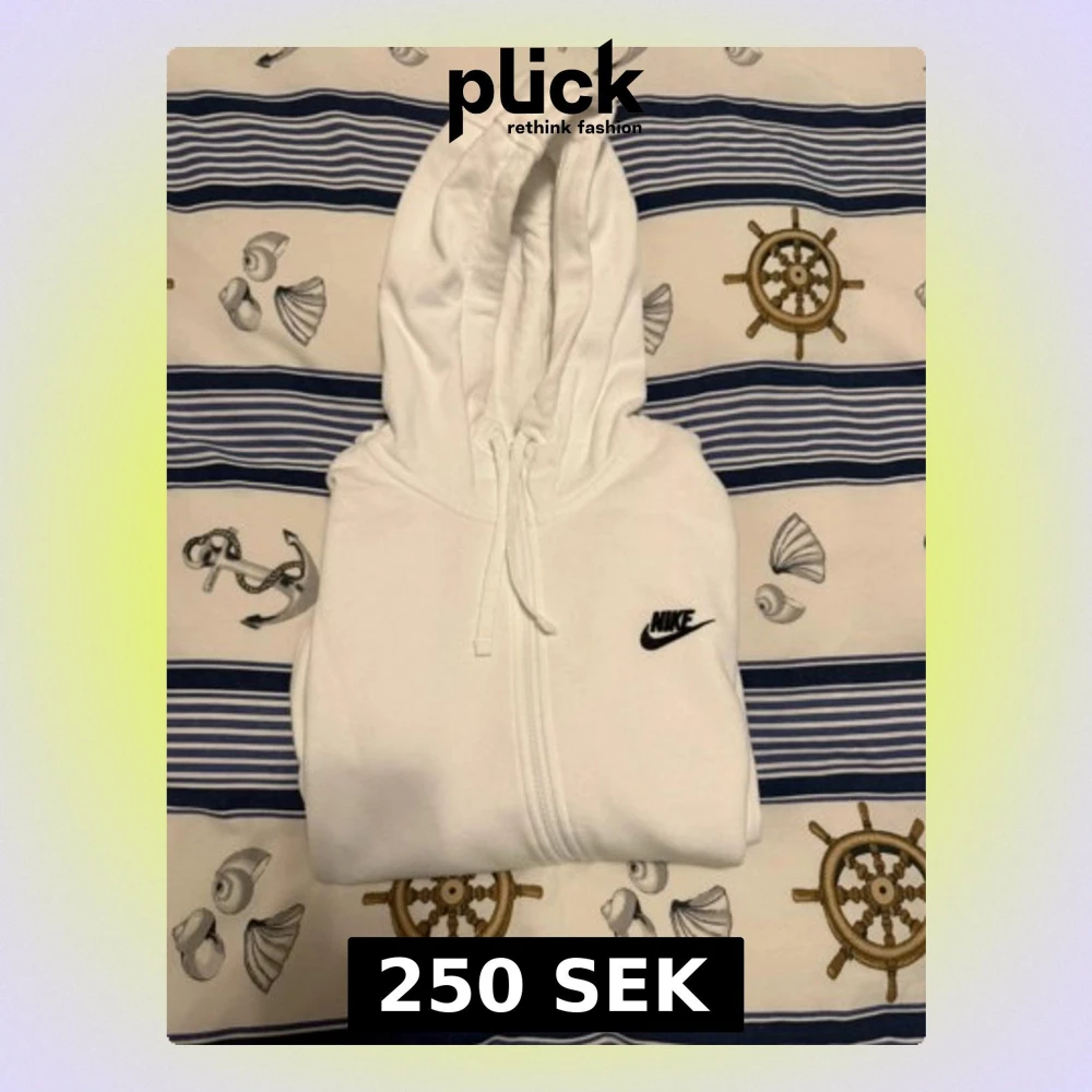 Vit hoodie från Nike med svart logga på bröstet. Tröjan har huva med snörning, två fickor fram och hel dragkedja. Tillverkad i mjuk bomullsmix med fleece på insidan för extra komfort. Perfekt för chill eller träning.
