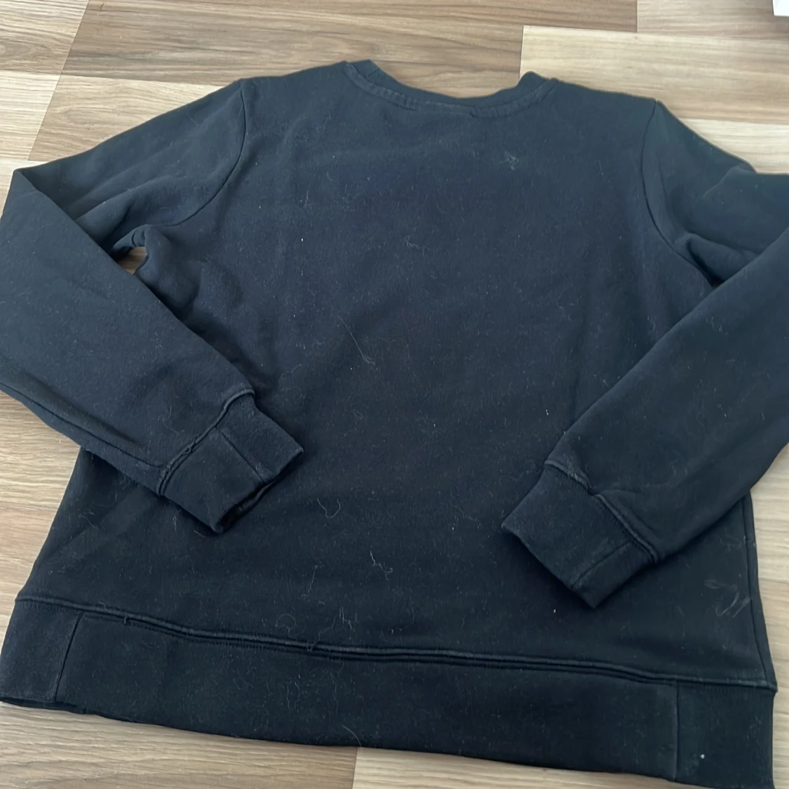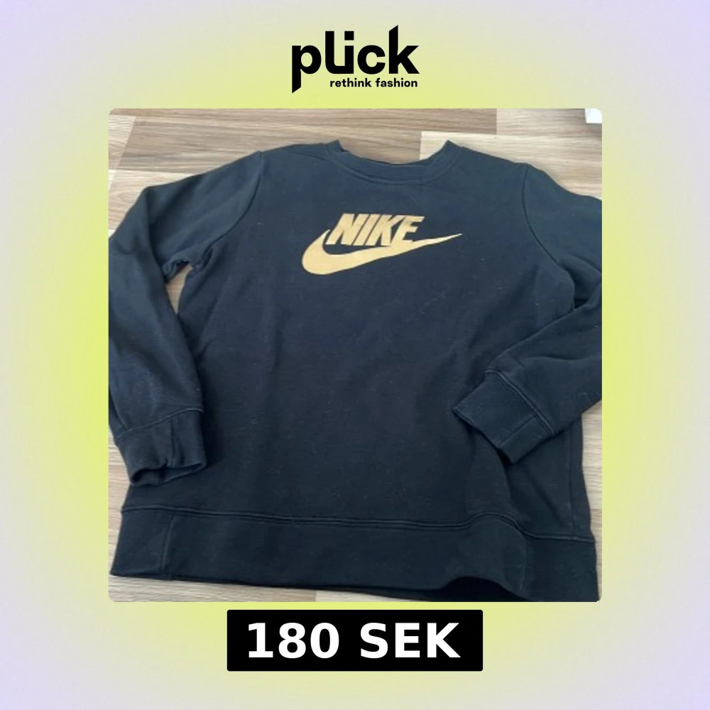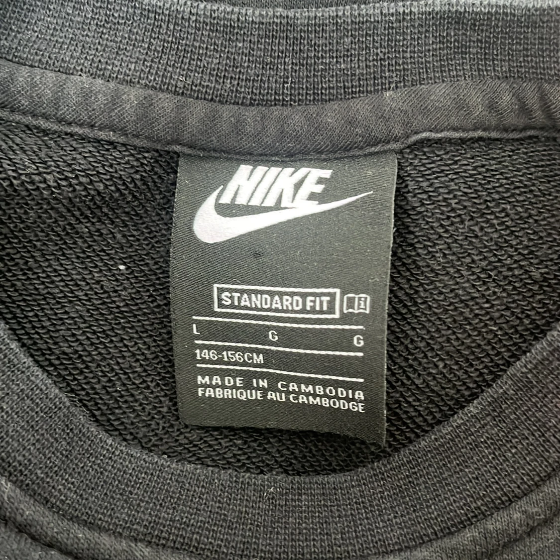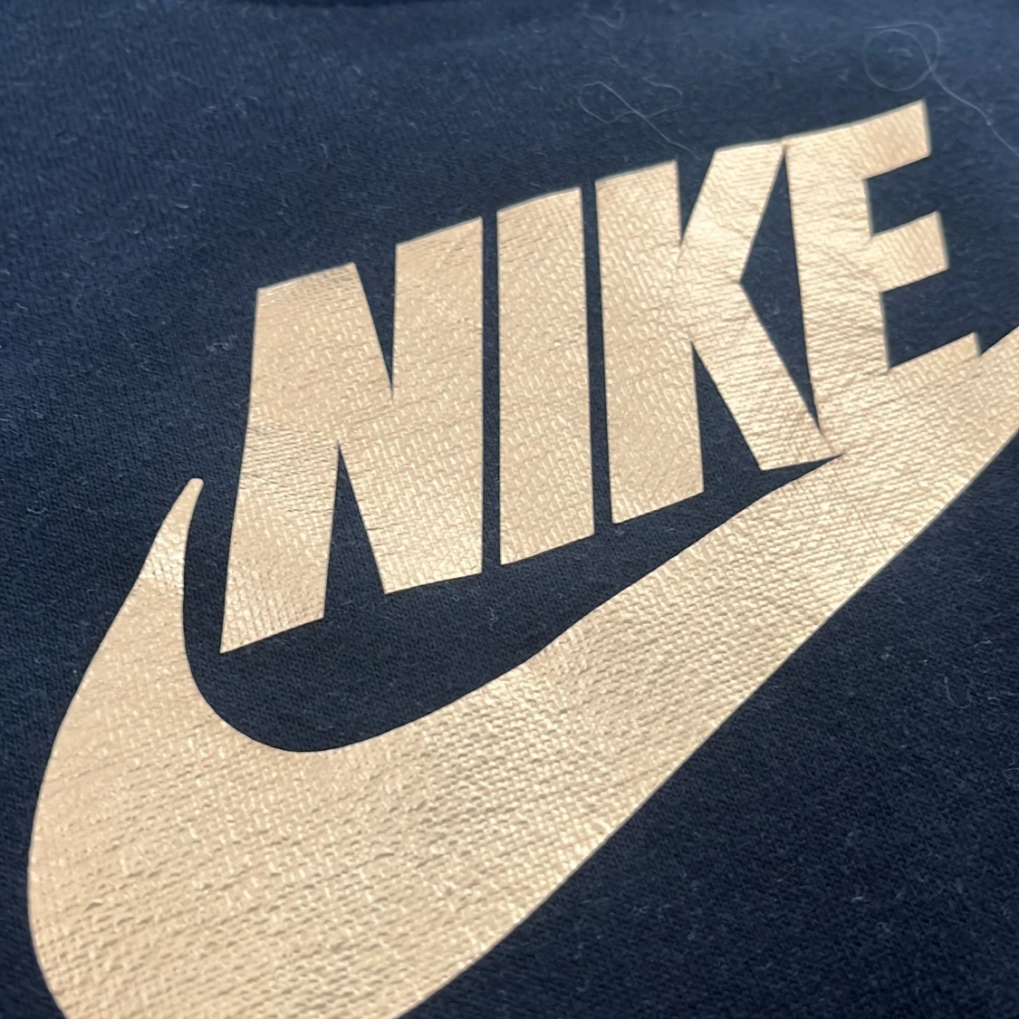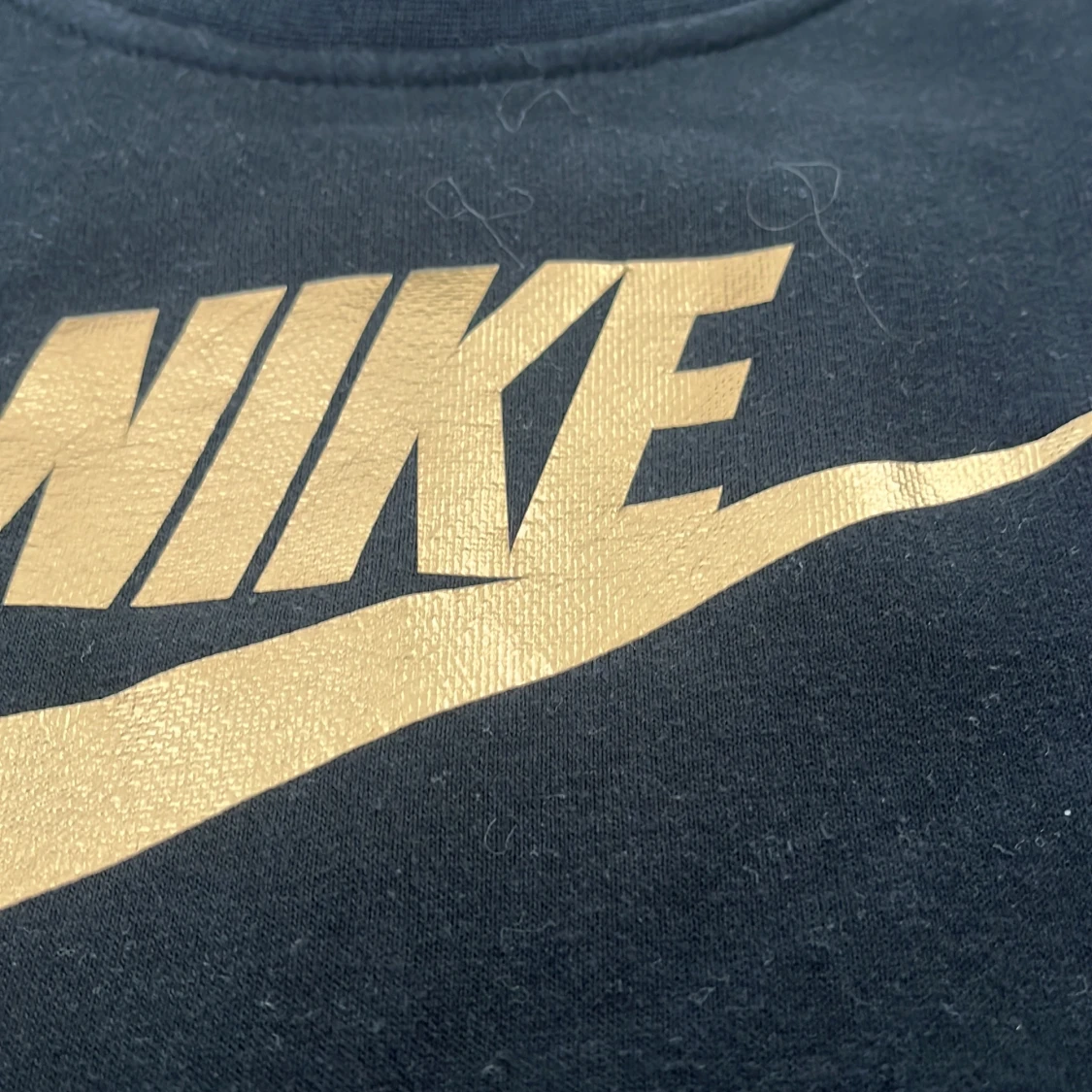 Svart sweatshirt från Nike med stort guldigt logotryck på bröstet. Tröjan har rund hals, långa ärmar och ribbade muddar vid ärmslut och nederkant. Standard fit och tillverkad i mjuk bomullsmix, perfekt för chill eller sport.