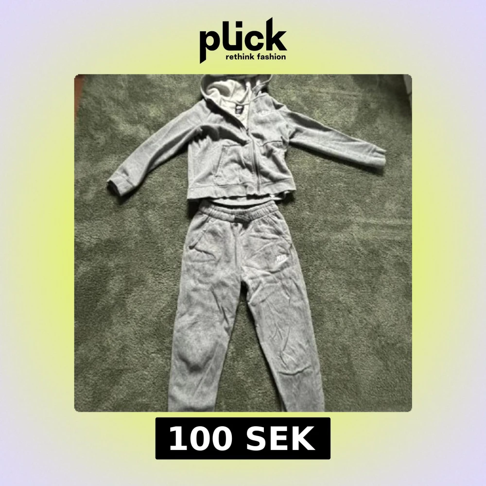 Säljer en grå hoodie och matchande byxor från Nike. Hoodien har dragkedja och långa ärmar, perfekt för en avslappnad stil. Byxorna har elastisk midja och sidofickor. Båda delarna är i standard fit och tillverkade i mjukt material. Inga skador eller hål, knappt använt. De e barnstorlek