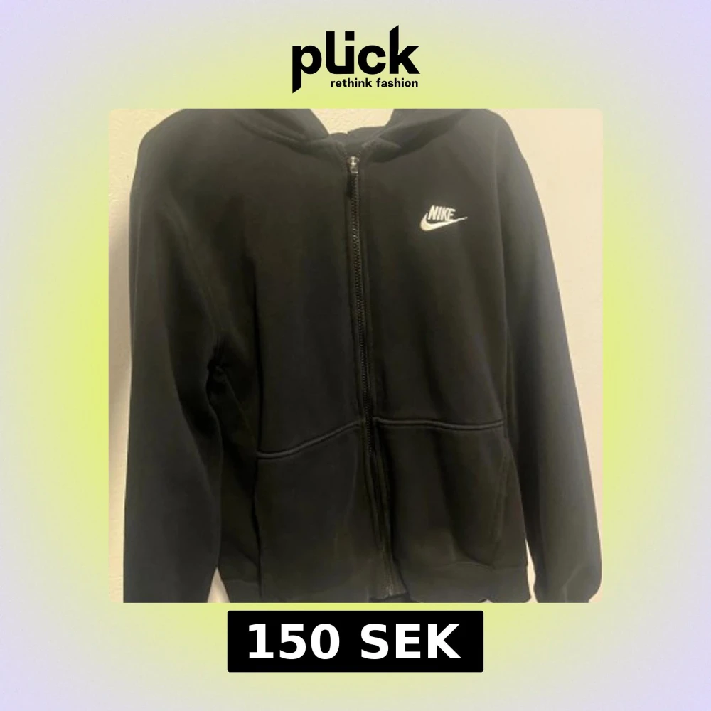 Svart hoodie från Nike i storlek 158-170 (barn XL) med vit logga på bröstet. Tröjan har huva, hel dragkedja framtill och två stora fickor. Tillverkad i mjuk bomullsblandning. Använd bara ett fåtal gånger så i den är i väldigt bra skick
