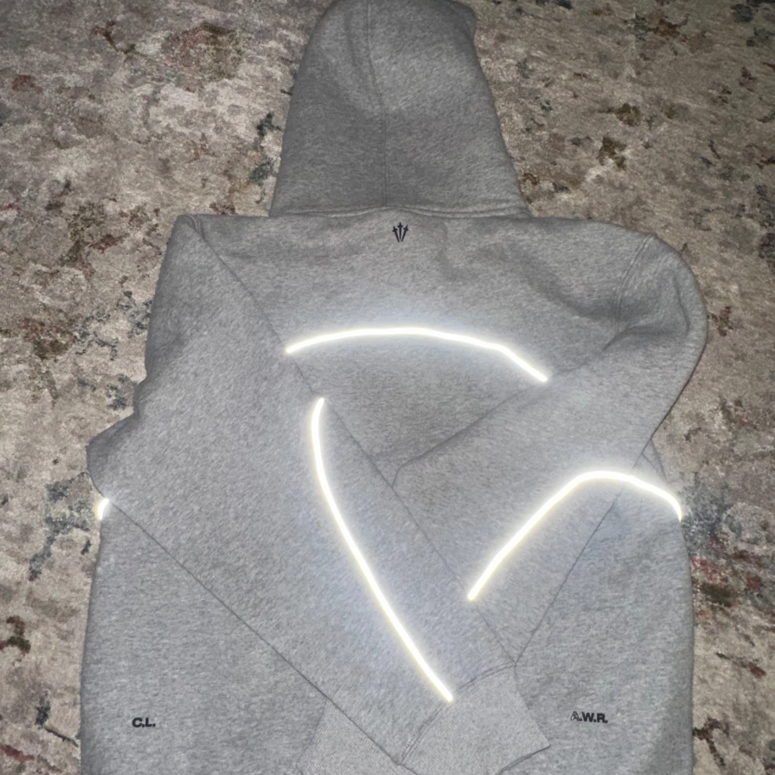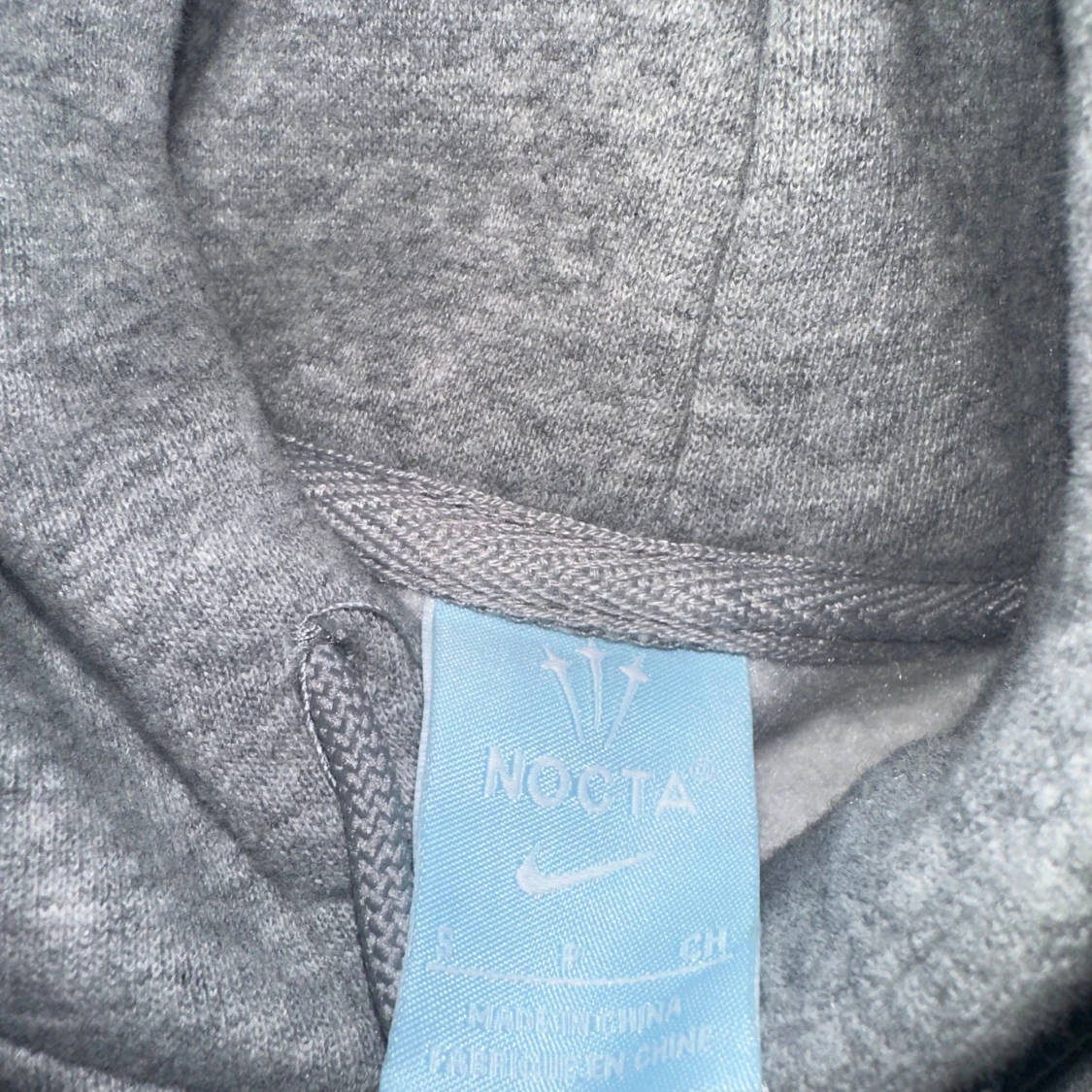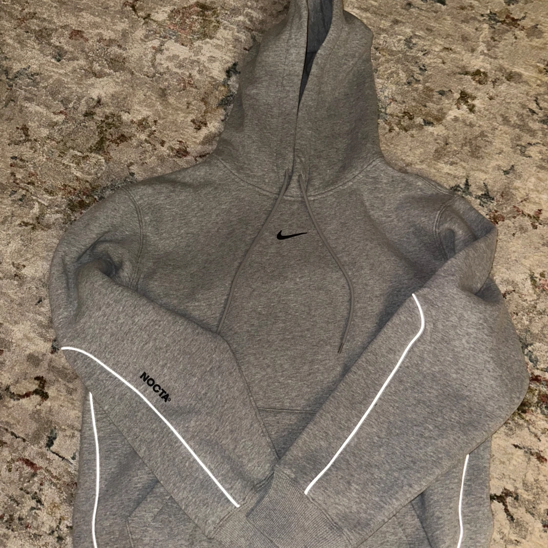Säljer en grå Nike NOCTA hoodie med snygga reflexdetaljer längs ärmarna och diskret NOCTA-tryck. Klassisk huva med snörning och broderad Nike-logga på bröstet. Mjuk bomullsblandning och ribbade muddar för extra komfort. Perfekt för dig som gillar streetwear.