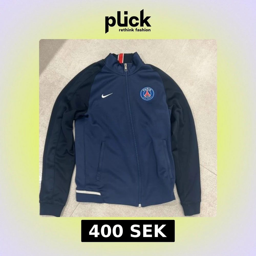 Marinblå ziptröja från Nike med PSG-logga på bröstet. Tröjan har hel dragkedja, ståkrage och långa ärmar i en något mörkare blå nyans. Snygg detalj med röd och vit rand i nacken och diskret vit Nike-logga på framsidan. Använt bara en gång