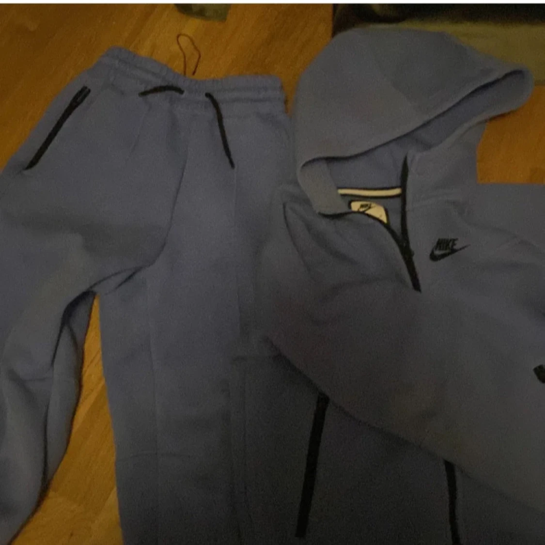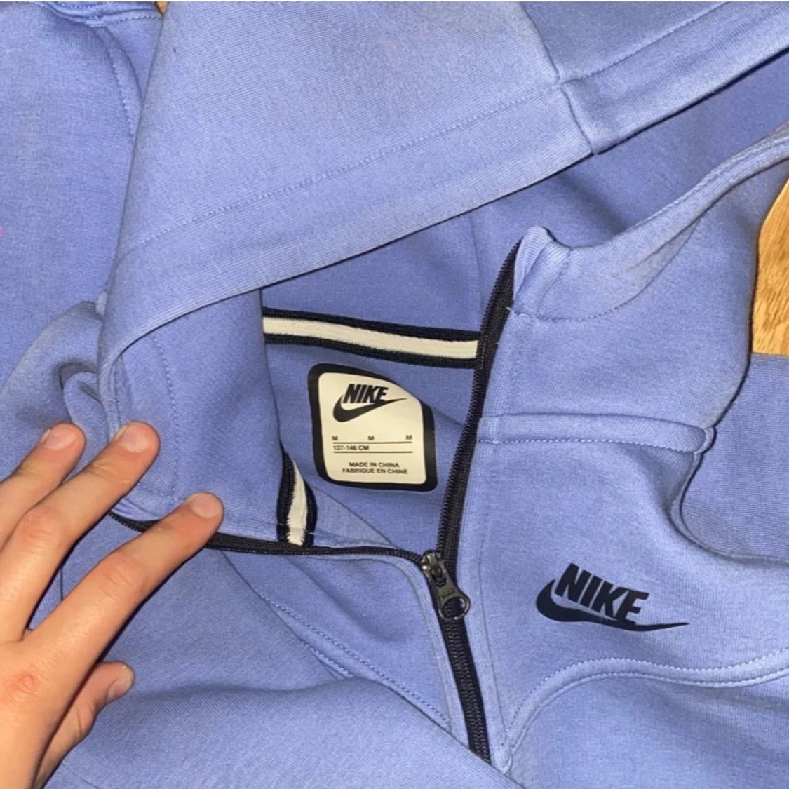 Säljer en blå hoodie från Nike med dragkedja och huva. Och det är färgen blå det är en väldigt snygg Nike teck annars