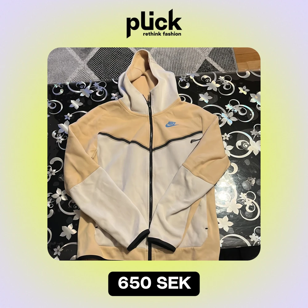 Säljer en snygg beige och vit kofta från Nike i storlek S. Den har en dragkedja framtill och en luva för extra mysfaktor. Perfekt för höst och vår, med en stilren design och Nike-logga på bröstet.