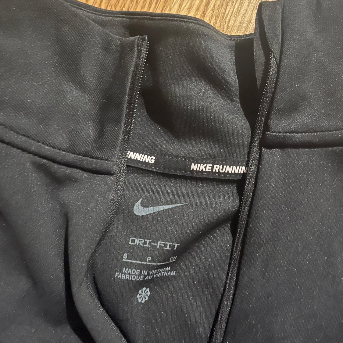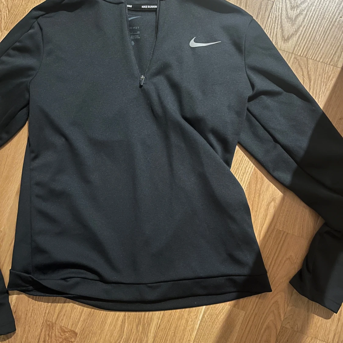 Säljer en svart långärmad tröja från Nike med dragkedja vid halsen. Tröjan är tillverkad i Dri-FIT-material, perfekt för löpning och träning. Den har en stilren design med Nike-logga på bröstet.