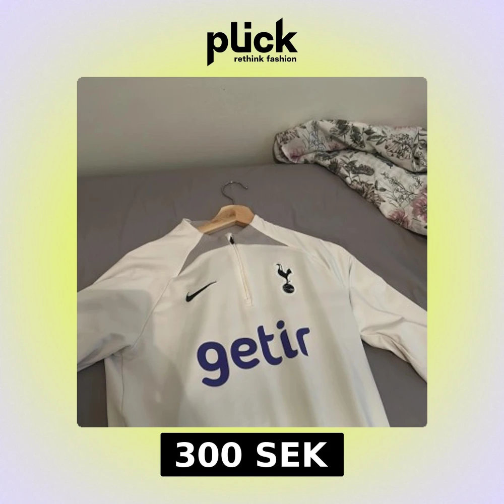 Säljer en vit långärmad Tottenham Hotspur träningströja från Nike med dragkedja vid halsen. Tröjan har klubbens emblem på bröstet, svart Nike-logga och sponsortryck i lila. Tillverkad i ett lätt och sportigt material, perfekt för fotbollsträning.stl S