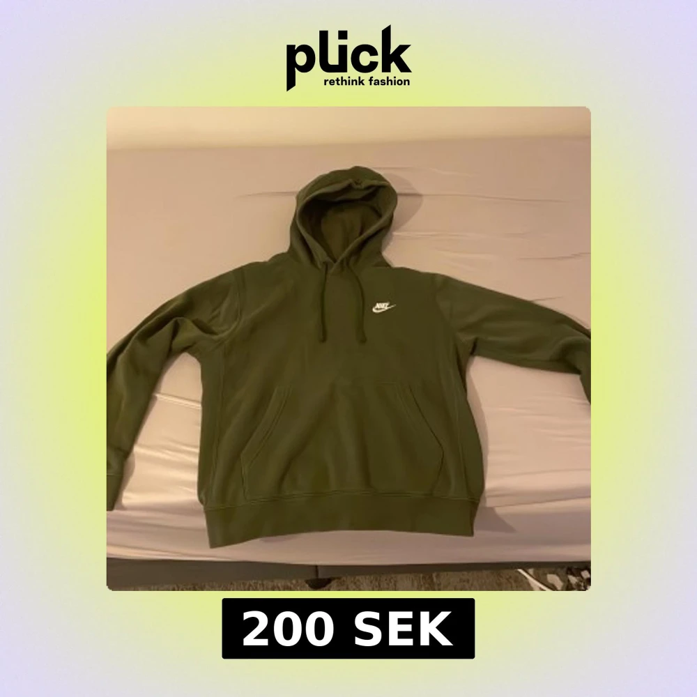 Säljer en snygg olivgrön hoodie från Nike med klassisk logga på bröstet. Tröjan har en bekväm passform med långa ärmar och en praktisk magficka. Perfekt för en avslappnad stil.
