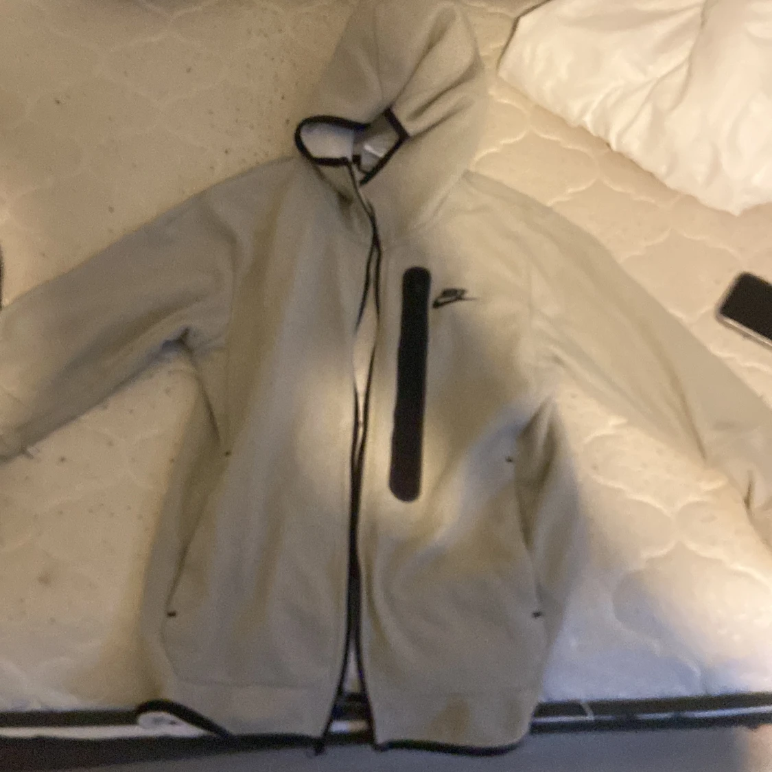 Säljer limeted edition en grå hoodie från Nike med hel dragkedja och svart detalj på bröstet. Tröjan har huva med snörning och långa ärmar. Perfekt för dig som gillar sportig och avslappnad stil.