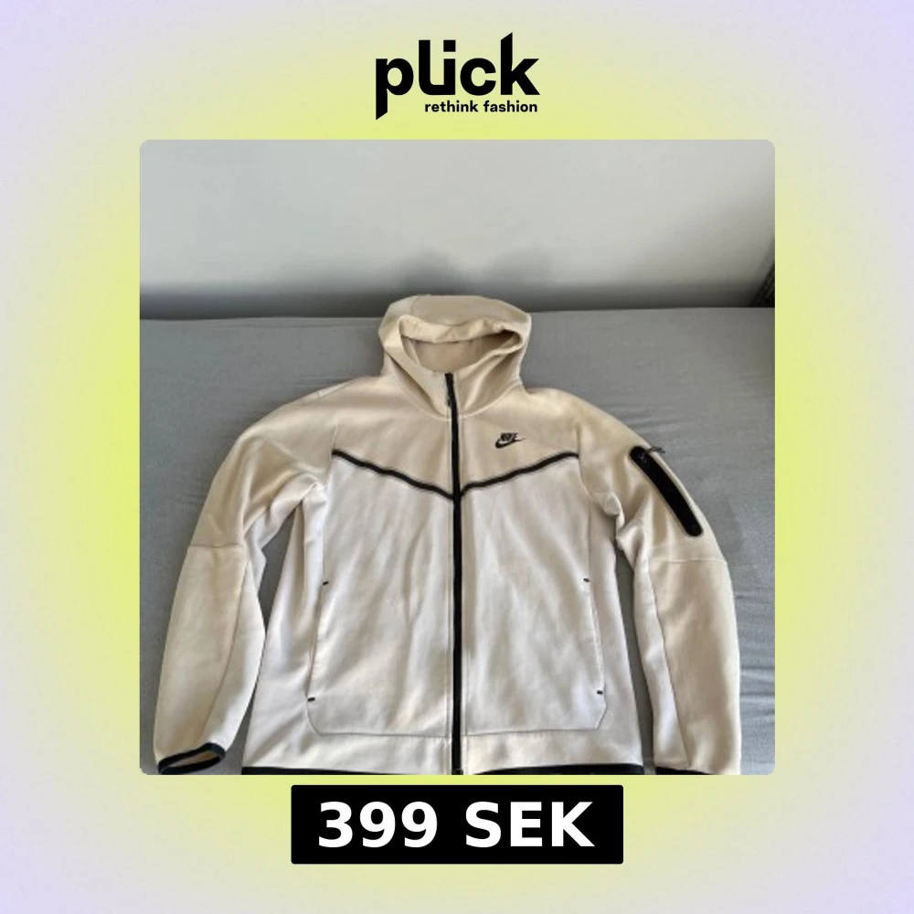 Snygg beige Tech Fleece från Nike med svart dragkedja och detaljer. Jackan har huva, lång ärm och en praktisk ficka med dragkedja på ena ärmen. Perfekt för dig som gillar sportig och clean stil. Storlek S men passar även M