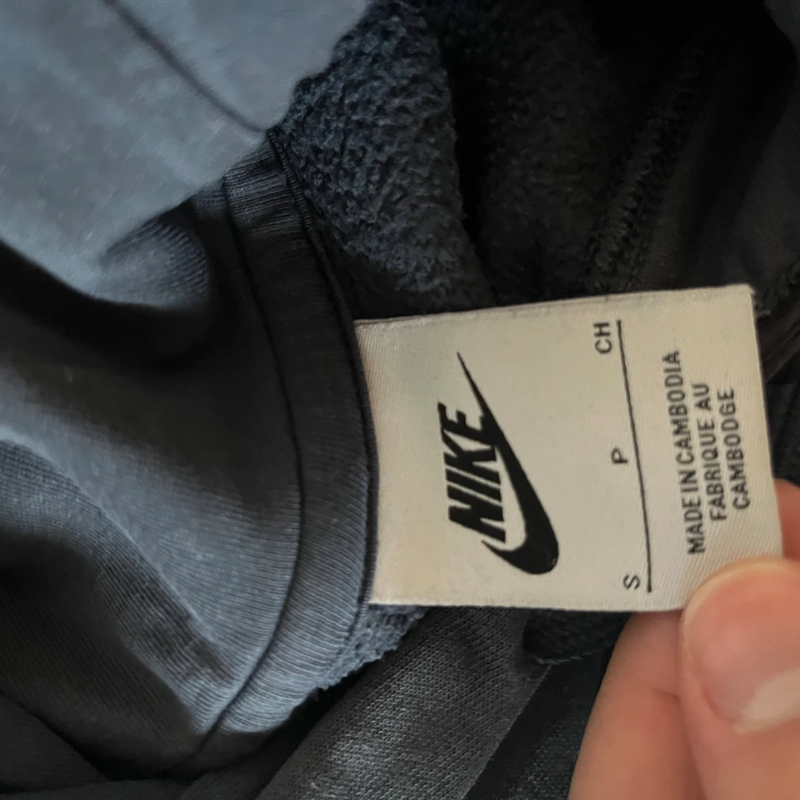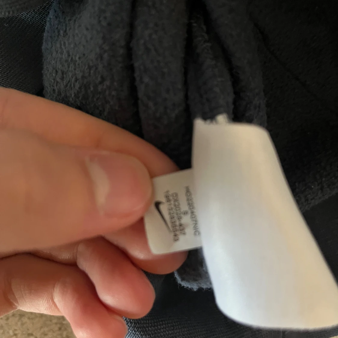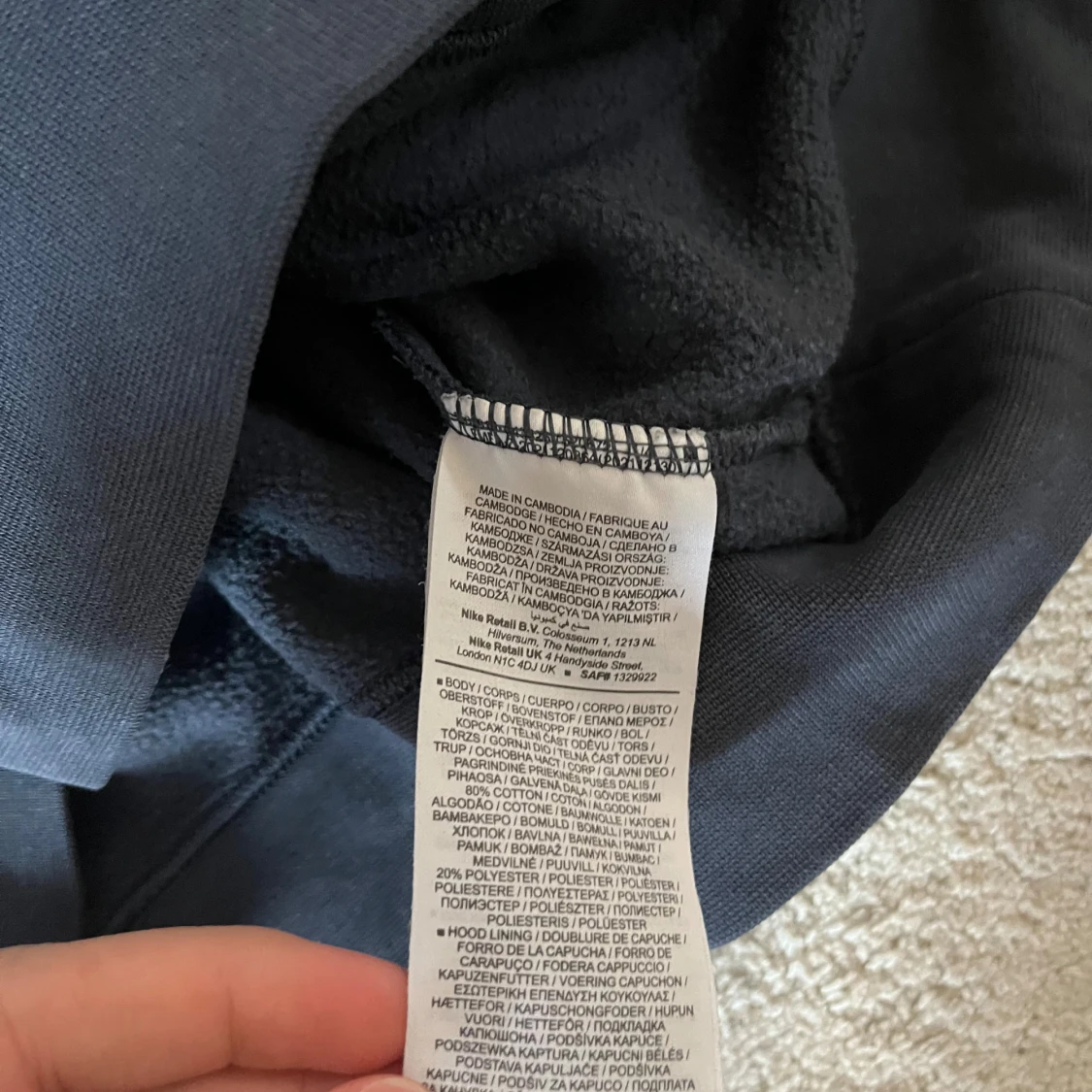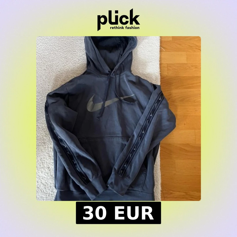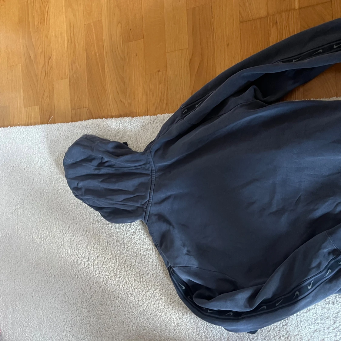 Svart hoodie från Nike i storlek S med stor silvrig swoosh-logga på bröstet och mindre loggor längs ärmarna. Tröjan har huva med snörning och en klassisk magficka. Perfekt för dig som gillar sportig och avslappnad stil. Passar for M. Jag köpa från JD sports 80€