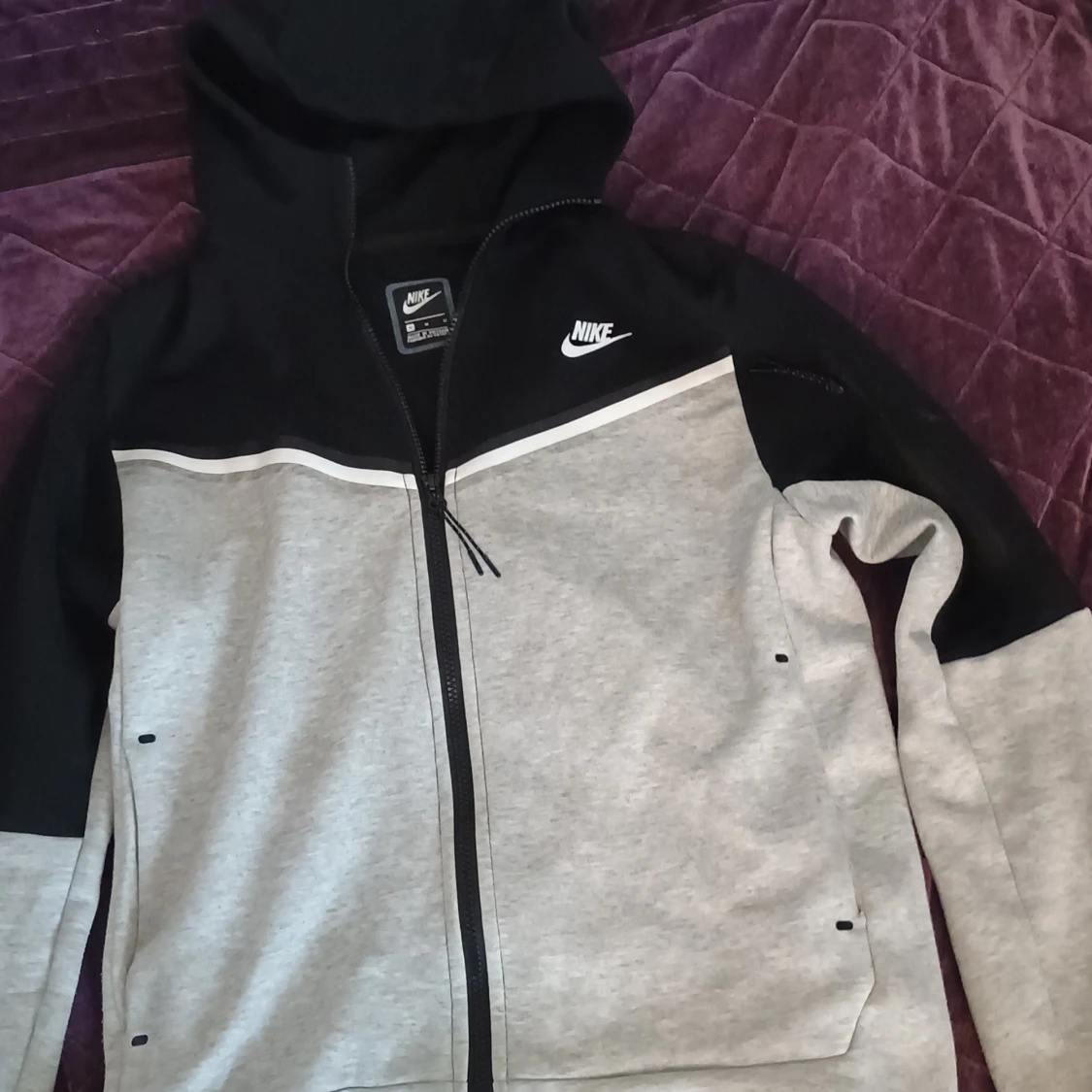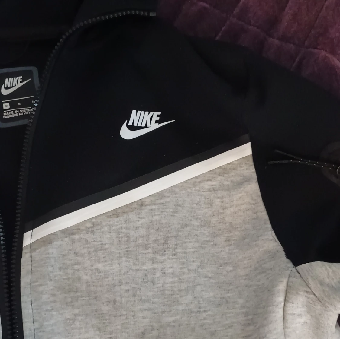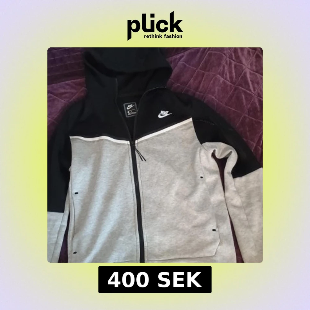 Nike hoodie i svart och ljusgrått med vit logga på bröstet. Tröjan har hel dragkedja, huva och långa ärmar. Snygg kontrast mellan färgerna och sportig look. Perfekt för chill eller träning. Klassisk streetstyle från Nike.