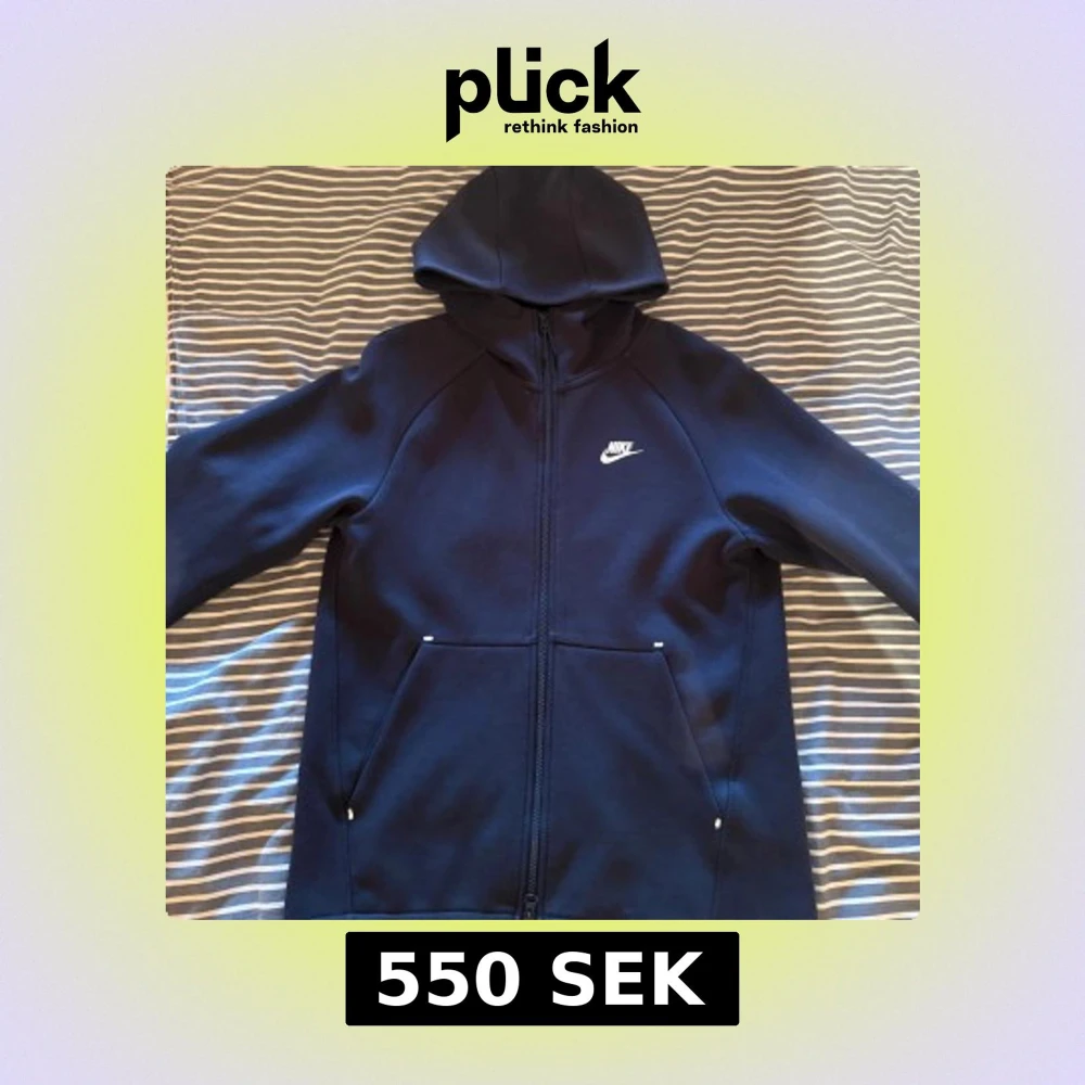 Säljer en mörk blå hoodie från Nike i storlek S. Tröjan har huva, hel dragkedja och två stora fickor framtill. Nike-loggan i vitt på bröstet ger en clean look. Perfekt för chill dagar eller när du vill ha en sportig stil.