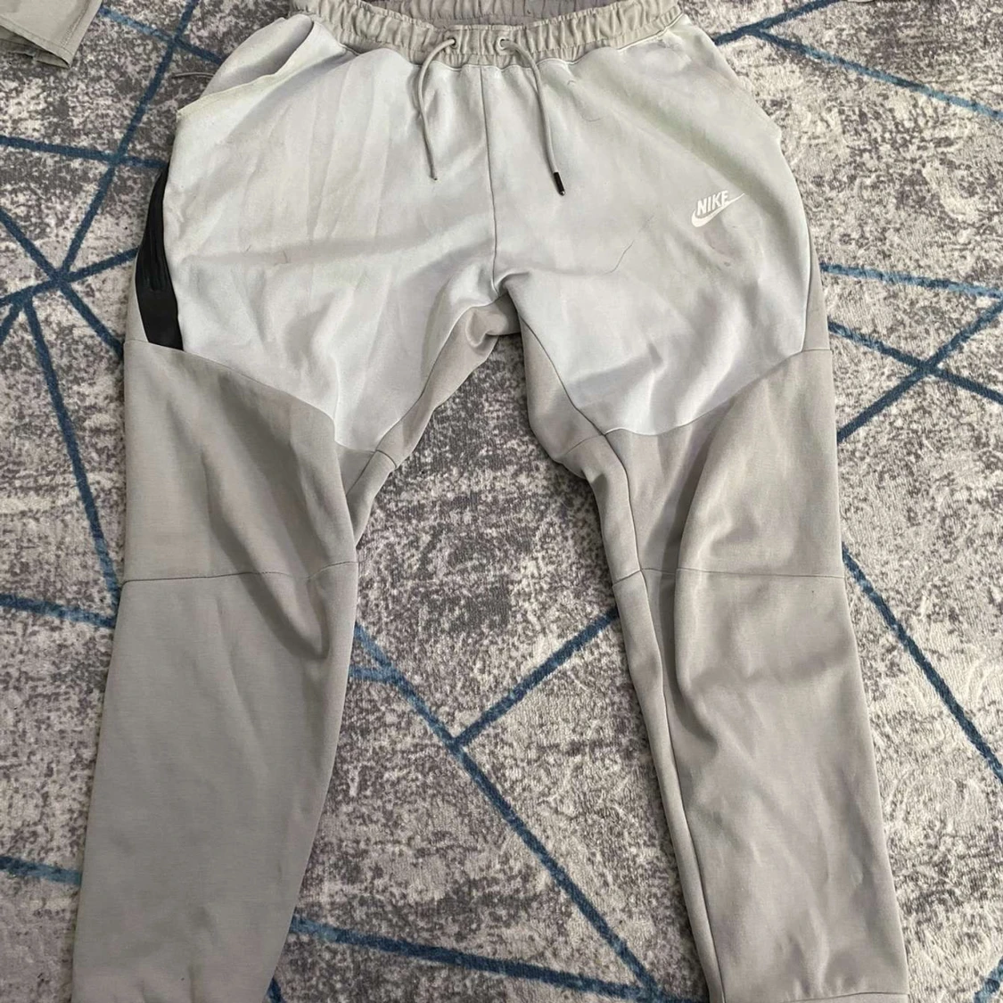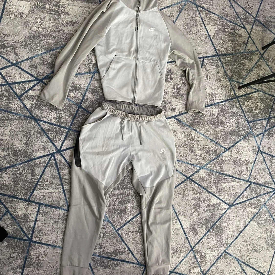 Säljer en grå hoodie och matchande byxor från Nike. Hoodien har dragkedja och långa ärmar, medan byxorna har elastisk midja och sidofickor. Perfekt för en avslappnad stil.