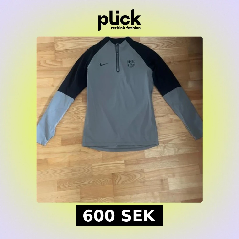 Grå och svart långärmad träningströja från Nike med FC Barcelona-logga på bröstet. Tröjan har half zip framtill och är tillverkad i Storm-FIT-material som står emot väder. Perfekt för fotbollsträning och sportiga dagar. Pris kan diskuteras