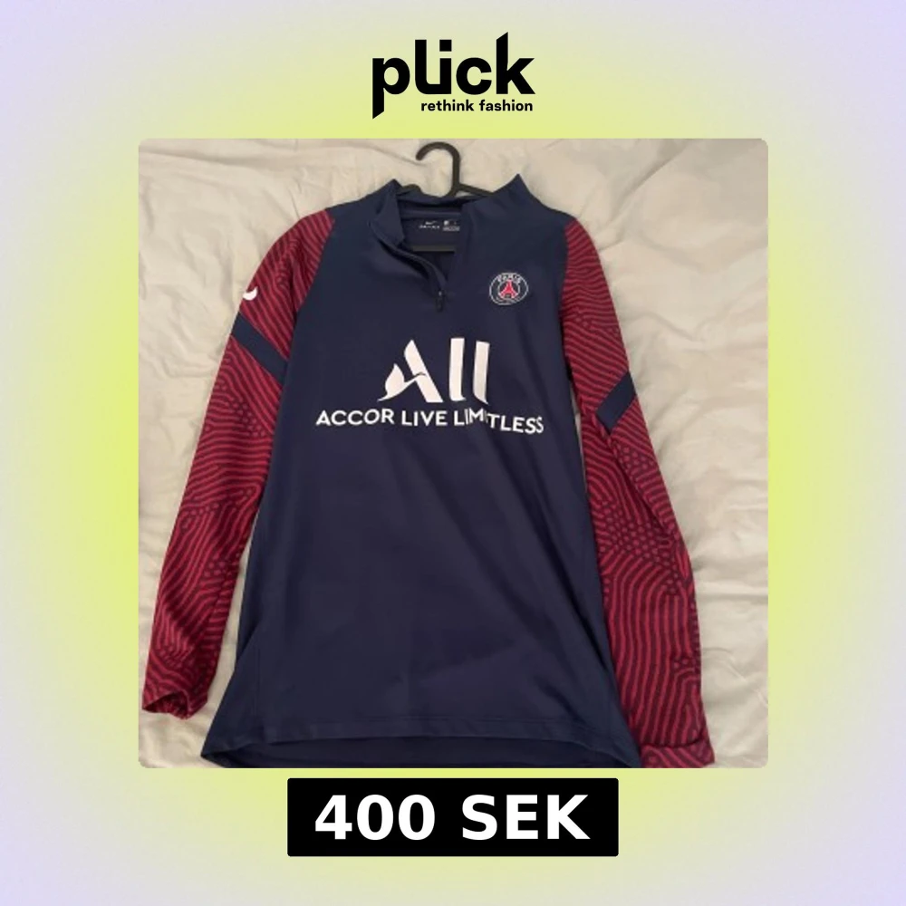 Paris Saint-Germain långärmad träningströja från Nike i mörkblått med röda ärmar och unikt mönster. PSG-logga på bröstet och Accor Live Limitless-tryck på framsidan. Materialet är lätt och andas, perfekt för fotbollsträning.