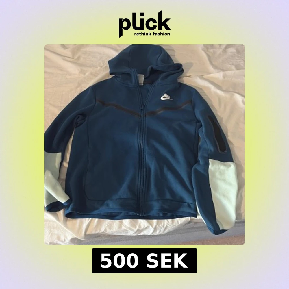 Nike hoodie i blått med ljusa partier på ärmarna och hel dragkedja framtill. Tröjan har huva, lång ärm och en liten ficka med dragkedja på ena ärmen. Perfekt för chill eller träning, klassisk Nike-logga på bröstet.