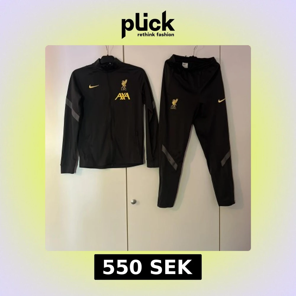 Säljer ett svart träningsset från Nike i samarbete med Liverpool FC. Setet består av en zip-jacka och matchande byxor med gula loggor och detaljer. Storlek på tröjan är 158-170 och storleken på byxorna är 170