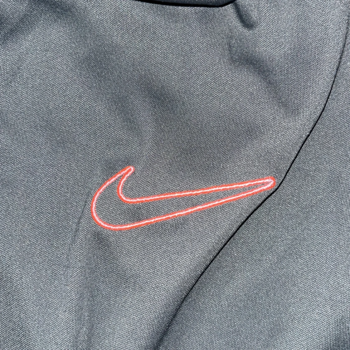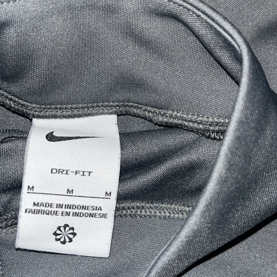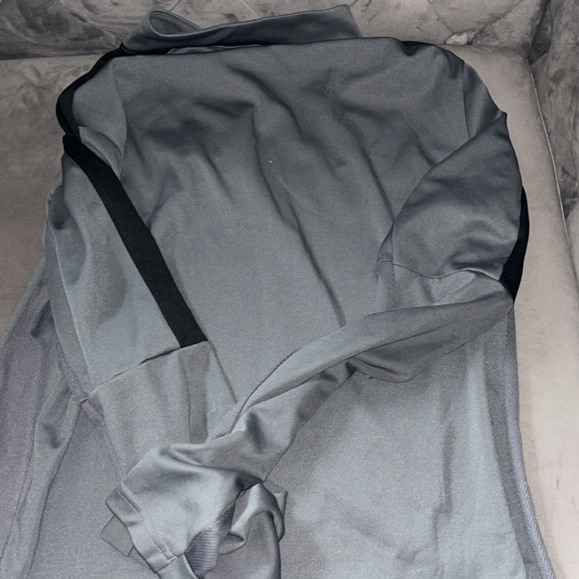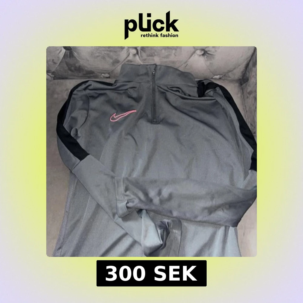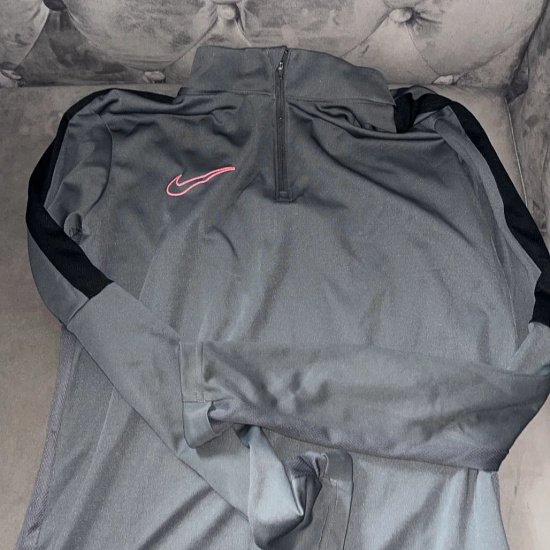 Säljer en grå långärmad träningströja från Nike med svart detalj längs ärmarna och halv dragkedja framtill. Tröjan har en röd Nike-logga på bröstet och är tillverkad i Dri-Fit material som andas.