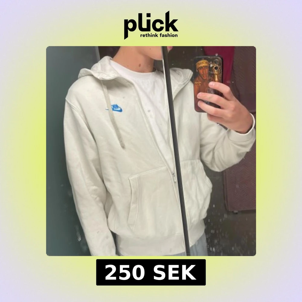 Säljer en clean vit hoodie från Nike med blå logga på bröstet. Tröjan har huva med snörning, dragkedja framtill och stora fickor. Perfekt för chill dagar eller när du vill ha en enkel och snygg look.