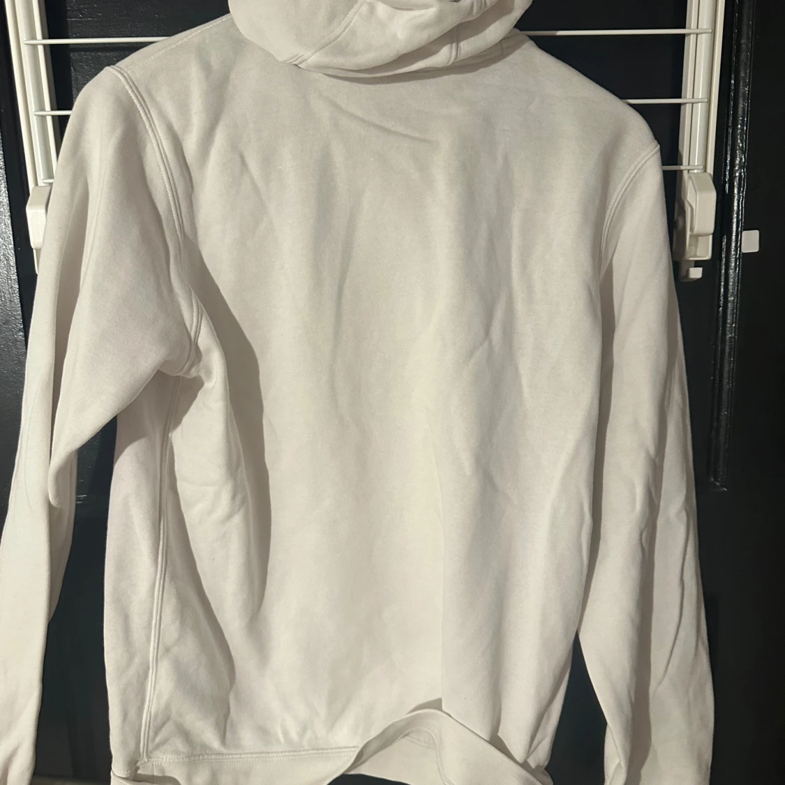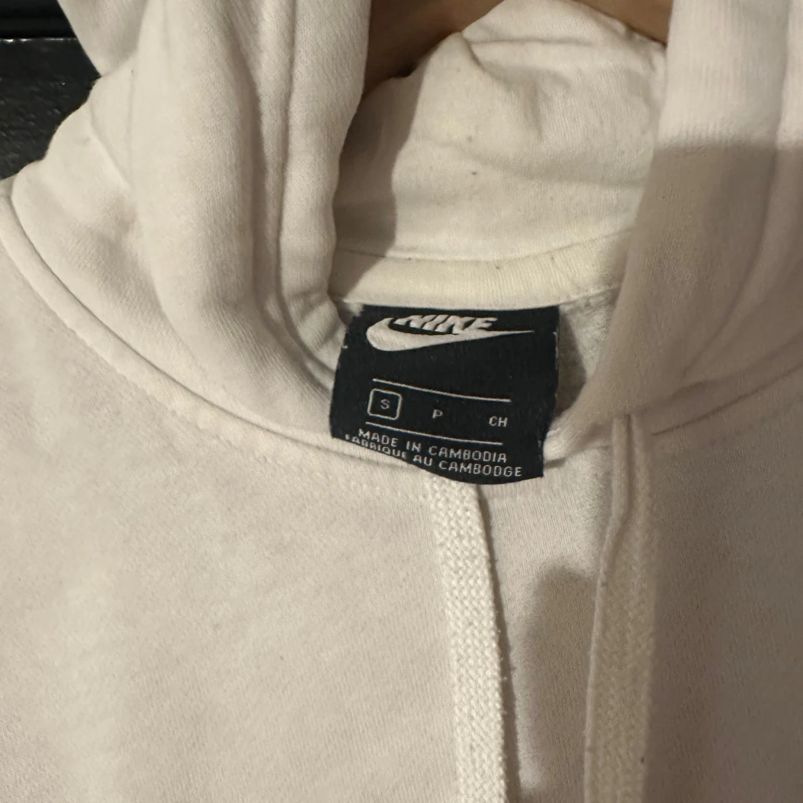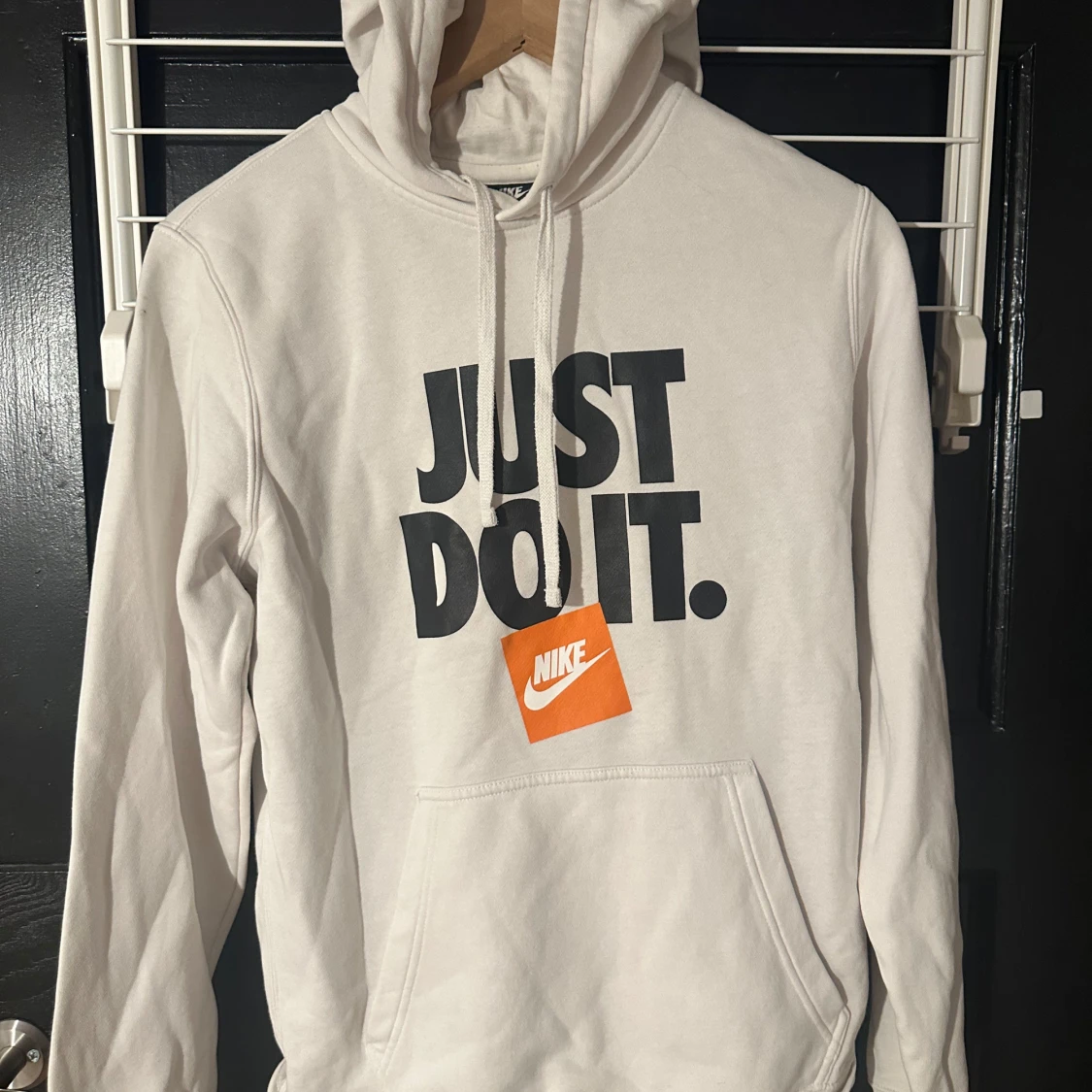 Säljer en stilren vit hoodie från Nike med det klassiska 'Just Do It' trycket i svart på framsidan. Hoodien har en bekväm passform med långa ärmar och en praktisk ficka framtill. Perfekt för en avslappnad stil.