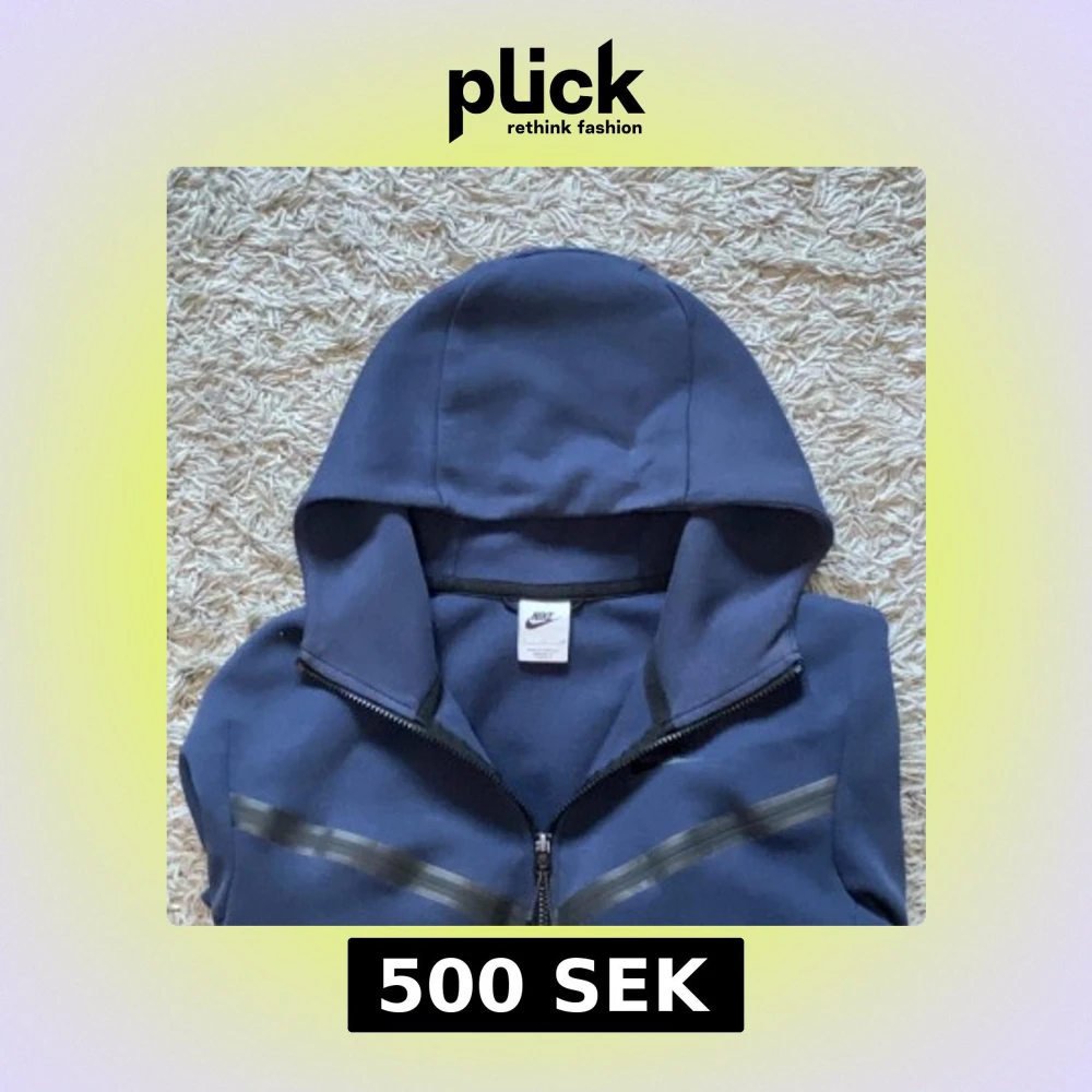 Nike hoodie i mörkblått med hel dragkedja och huva. Snygga svarta detaljer över bröstet och på ärmen. Storlek S passar även M.