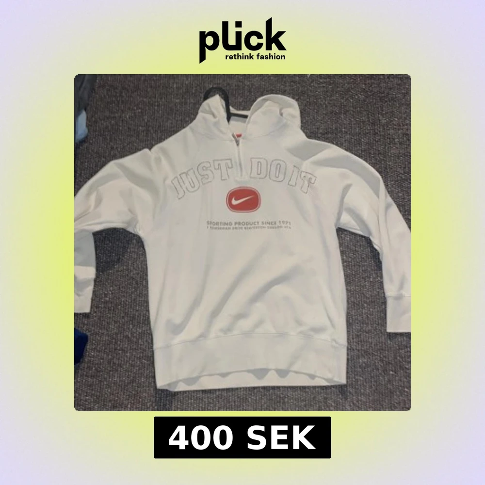 Säljer en vit hoodie från Nike med halv dragkedja och huva. Framsidan har stort tryck med texten 'JUST DO IT' och röd Nike-logga. Perfekt för en sportig och avslappnad stil. Långärmad och mjuk i materialet.