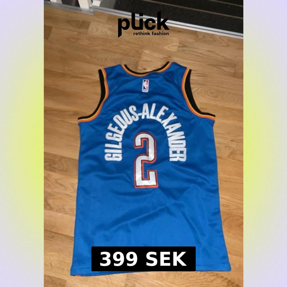 Säljer en blå Oklahoma City Thunder basketlinne med nummer 2 och Gilgeous-Alexander på ryggen. Linnet har svarta, gula och orange detaljer längs kanterna och är tillverkat i lätt polyester. Perfekt för dig som älskar basket och vill ha en snygg supportertröja.