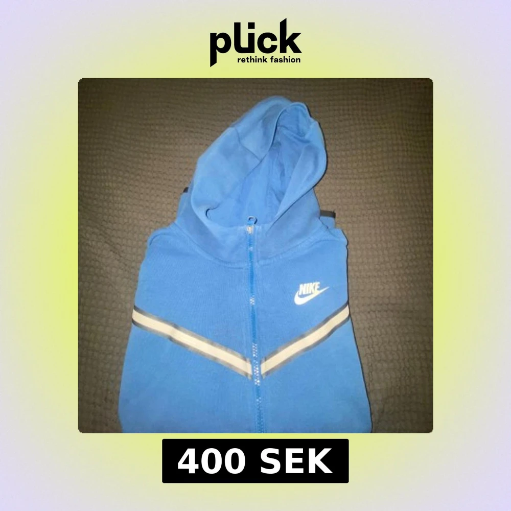 Snygg blå hoodie från Nike med dragkedja framtill och huva. Tröjan har vita och beige ränder över bröstet och en liten Nike-logga på vänster sida. Perfekt för en sportig och avslappnad stil.