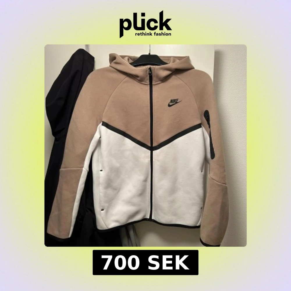 Nike hoodie i beige och vitt med svart logga på bröstet. Tröjan har hel dragkedja, huva och svarta detaljer längs dragkedjan och ärmen. Tillverkad i mjuk bomullsblandning, perfekt för chill eller träning. Snygg och sportig look med lång ärm och praktiska fickor.