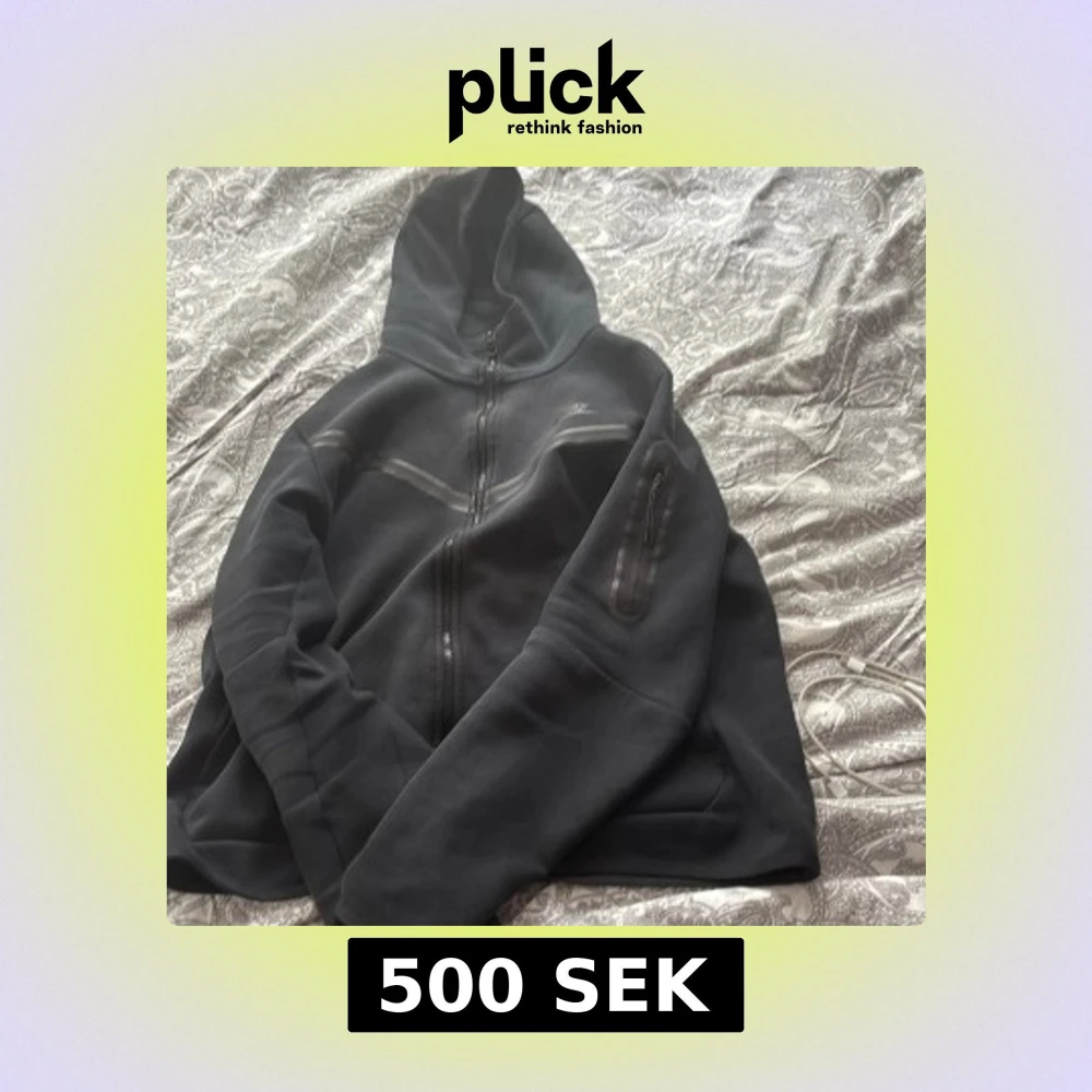 Säljer en svart hoodie med dragkedja framtill och huva. Tröjan har en ficka med dragkedja på ena ärmen och är tillverkad i ett mjukt material. Perfekt för kyliga dagar eller som ett extra lager.