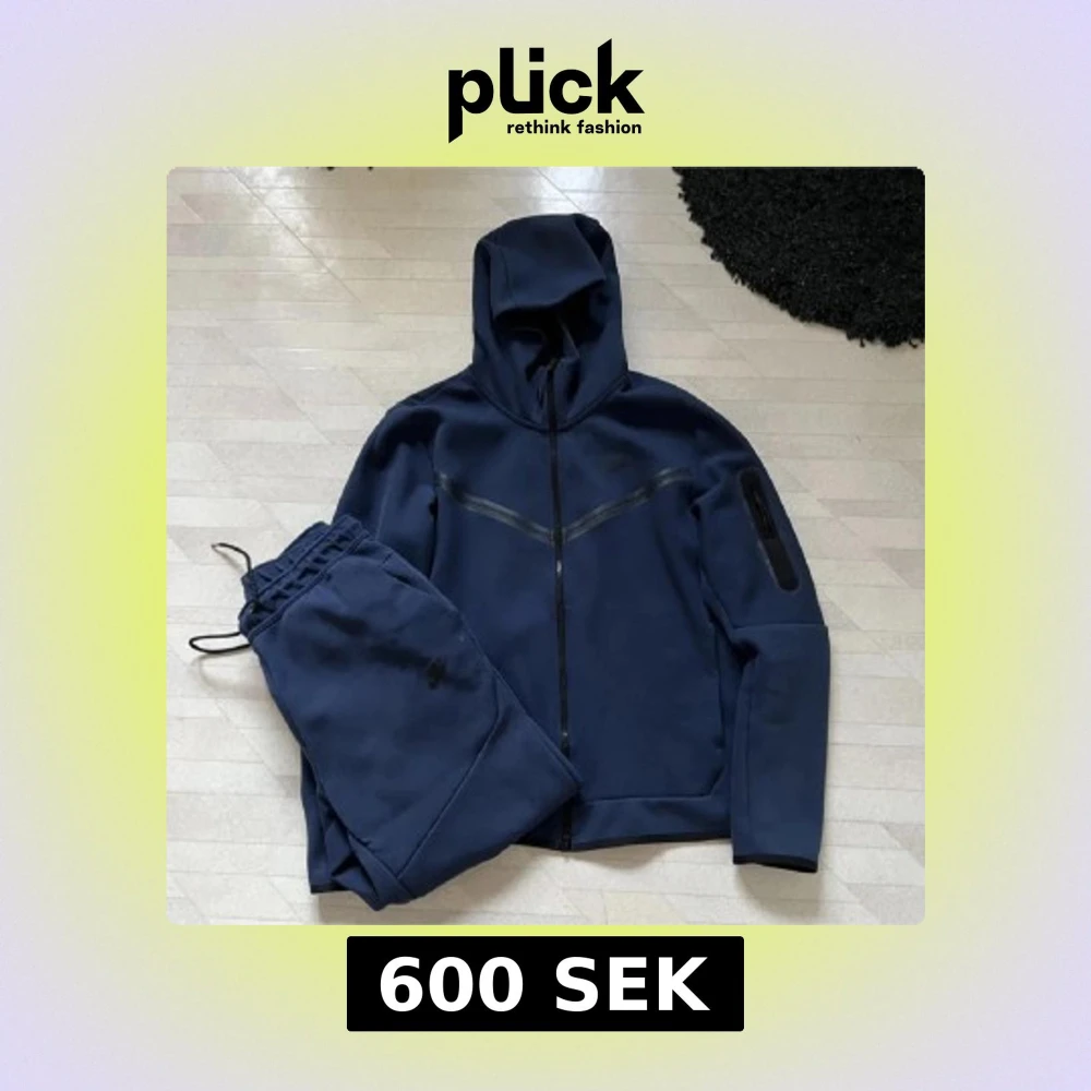 Säljer ett stilrent mörkblått nike tech set med dragkedja och huva. Tröjan har långa ärmar och en praktisk ficka på ärmen. Perfekt för en avslappnad stil. Tillkommer även byxorna till.