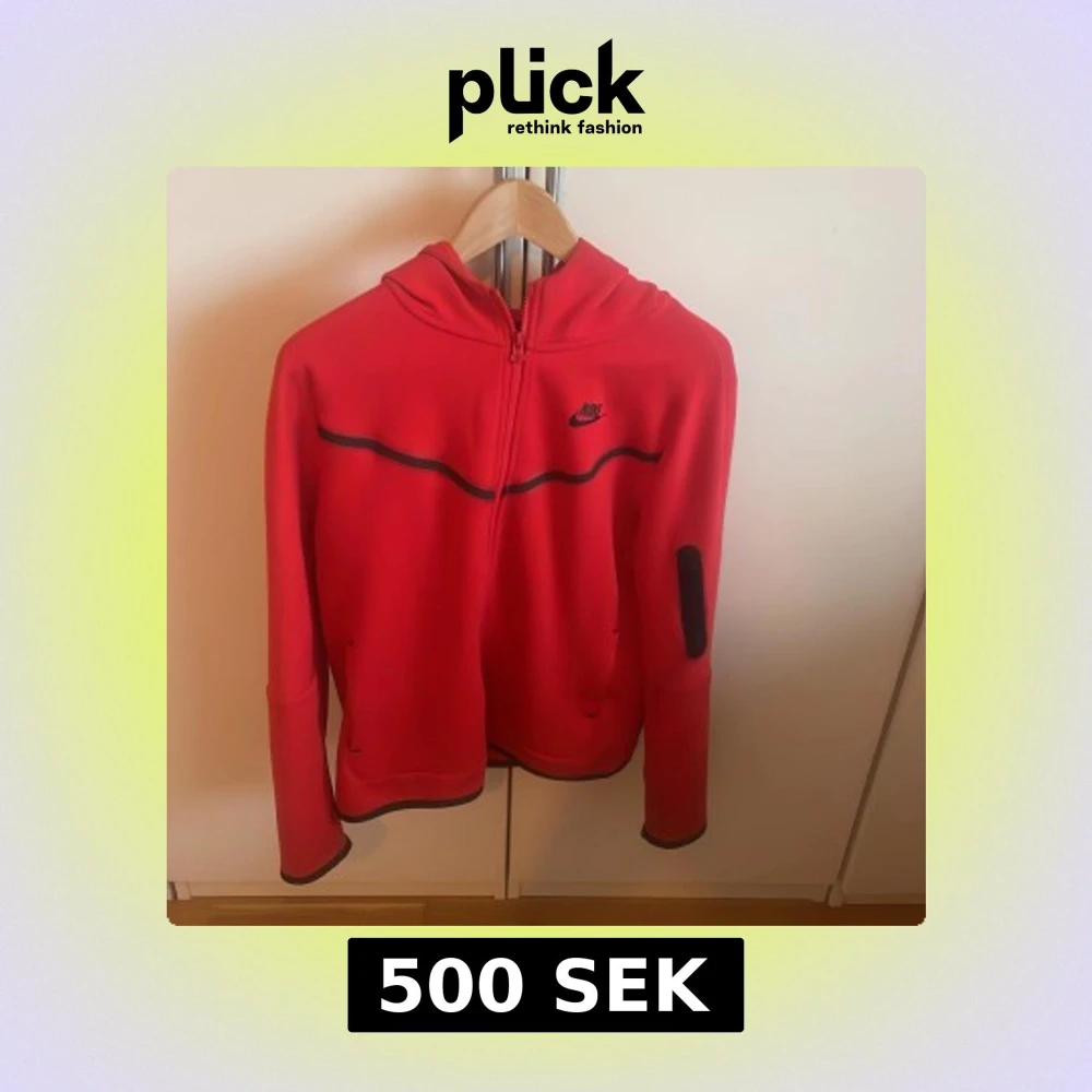 Säljer en snygg röd hoodie från Nike med dragkedja och huva. Den har svarta detaljer och är perfekt för en sportig look. Passar bra för kyligare dagar.Den är i barnstorlek XL