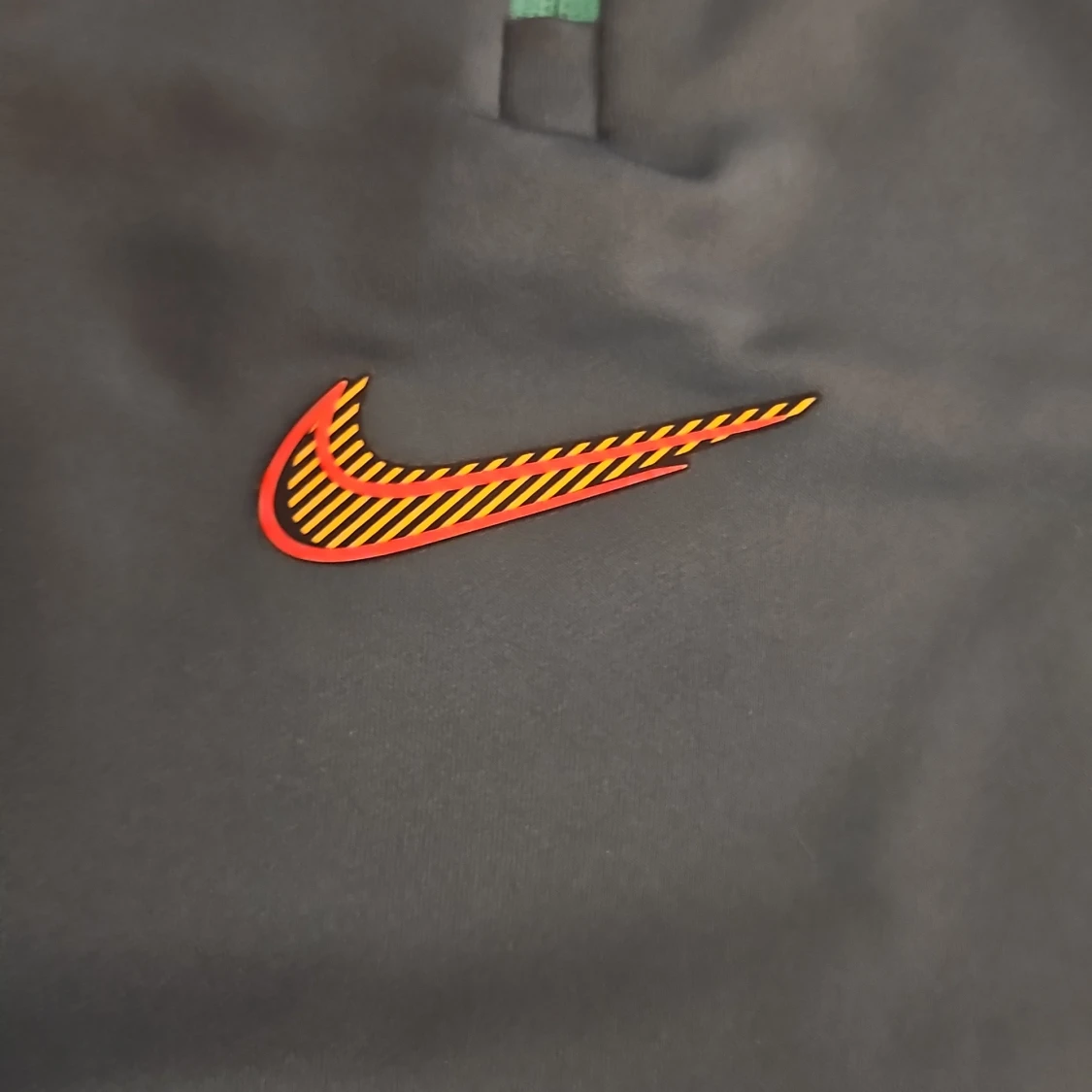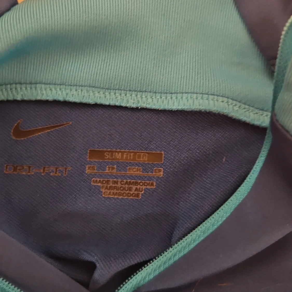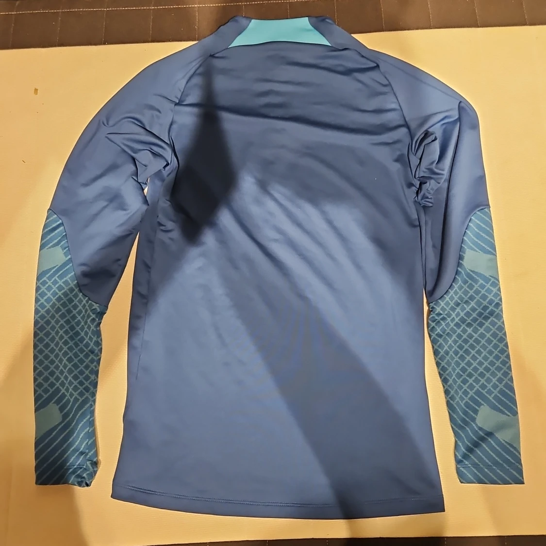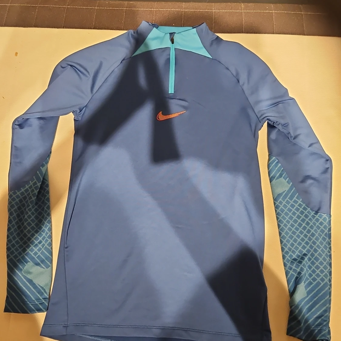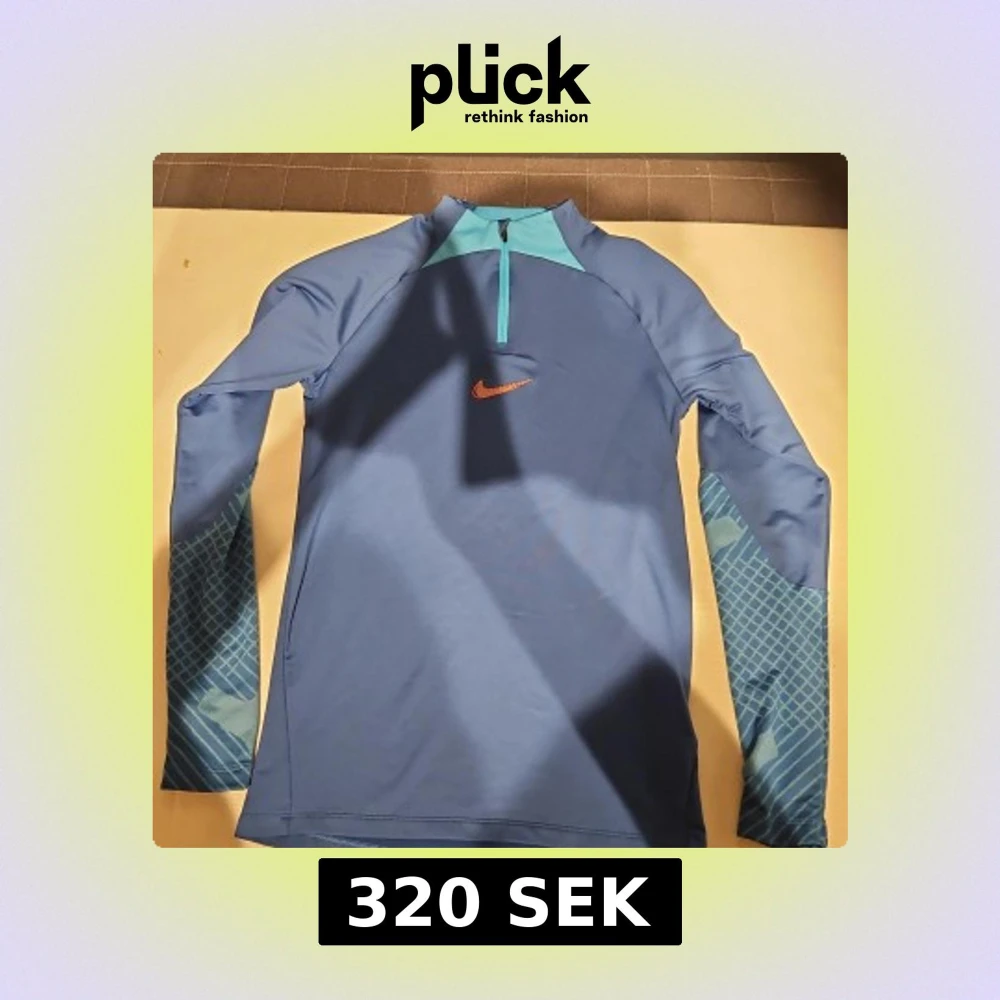 Nike Dri-Fit långärmad träningströja i blått med turkosa detaljer och mönstrade ärmar. Slim fit-modell med half zip och orange Nike-logga på bröstet. Perfekt för dig som vill ha en sportig och snygg look på gymmet eller ute.