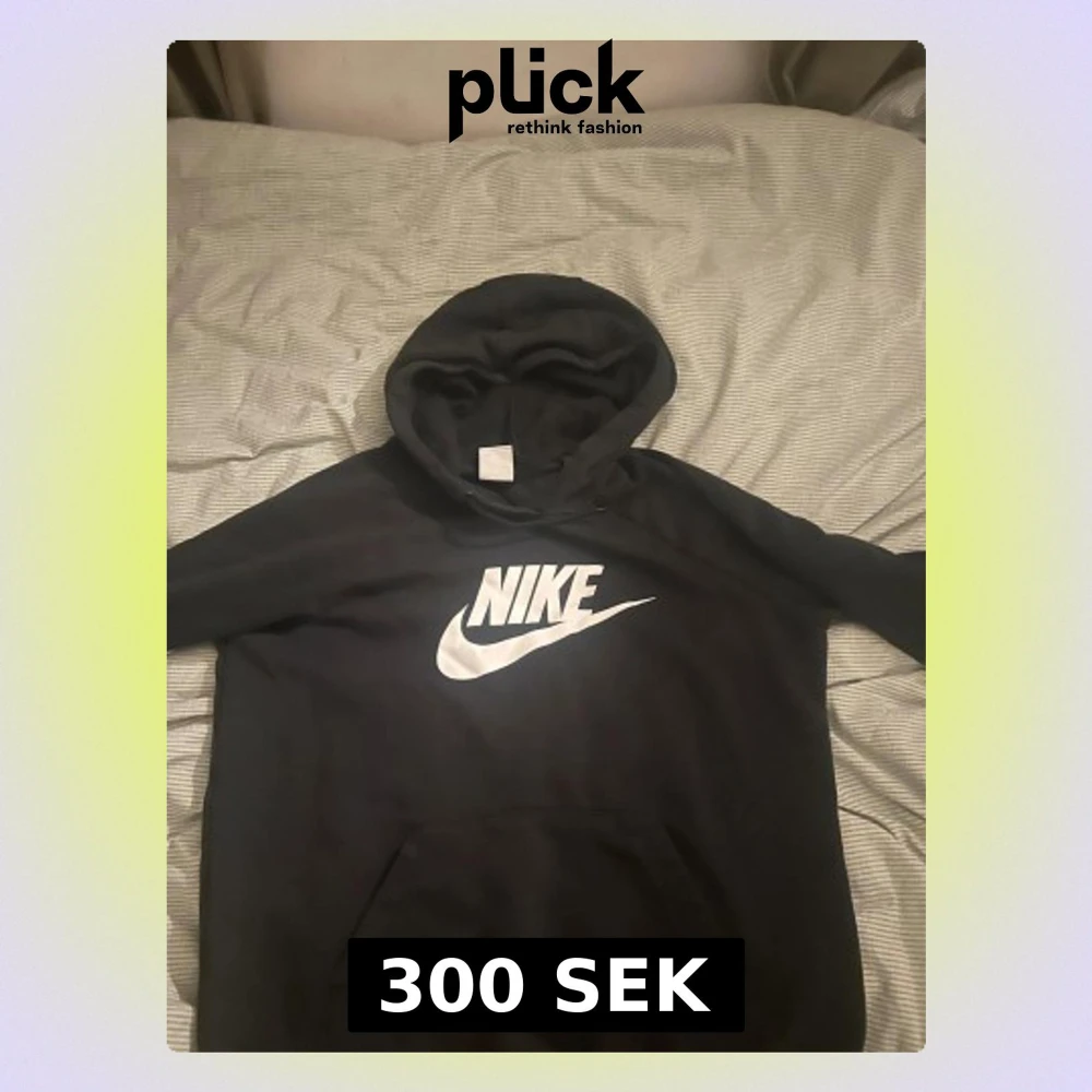 Svart hoodie från Nike i storlek M med stor vit Nike-logga på bröstet. Tröjan har huva och magficka, samt långa ärmar. Materialet är mjukt och känns som bomull och polyester, perfekt för chill dagar. Klassisk och enkel design som alltid funkar.