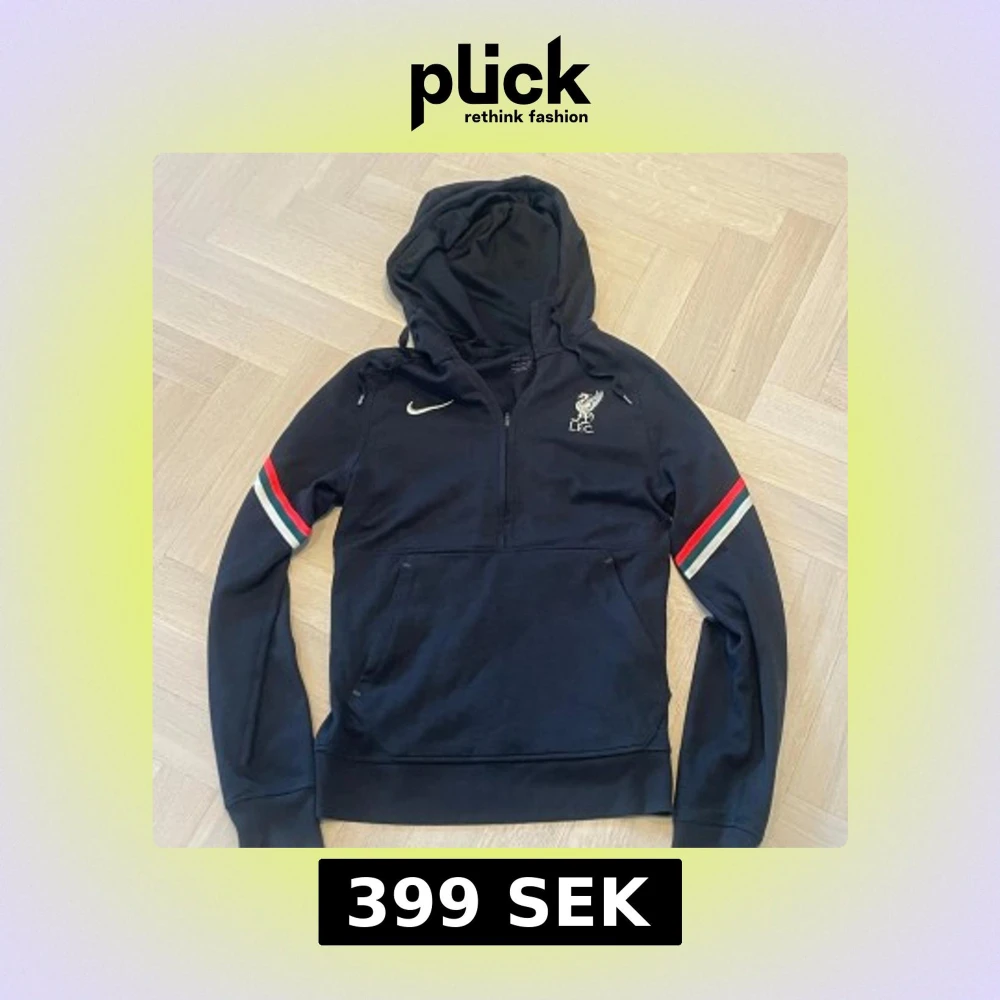 Svart hoodie från Nike med Liverpool FC-logga broderad på bröstet. Tröjan har huva, halv dragkedja och röda samt vita ränder på ärmarna. Tillverkad i Dri-FIT-material som andas. Perfekt för fotbollsälskare! Storlek XS